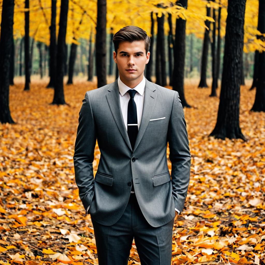 Preppy style man costume, photorealistic portrait of handsome young man, brown hair, blue eyes, wearing tan three-piece suit, red plaid tie, white shirt, red plaid pocket square, standing outdoors, blurred green and yellow trees in background, confident expression, hands in pockets, professional fashion style, soft lighting, daylight, sharp details, realistic ures