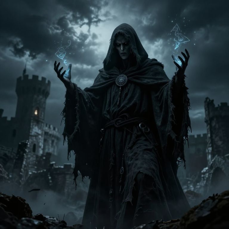 Create your own villain concept art, a mysterious figure cloaked in ragged robes, wielding ancient dark magic, with glowing runes floating around their hands and a haunting expression, ominous storm clouds gathering above a ruined castle