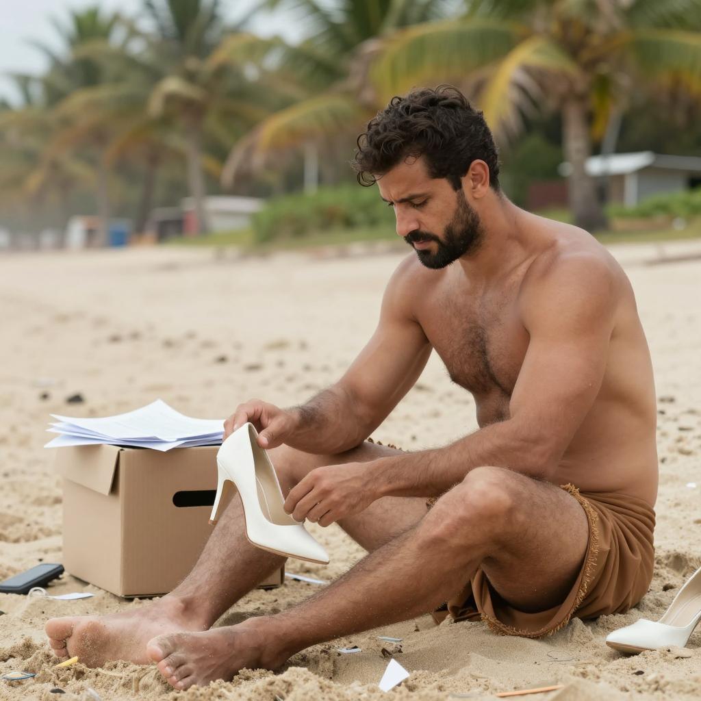 A shirtless, muscular man with short dark hair and a beard sits on a sandy beach, repairing white high-heeled shoes. He wears brown loincloth-like pants and holds one shoe in his right hand. A cardboard box with papers and scattered debris is behind him. Palm trees and green foliage fill the background.