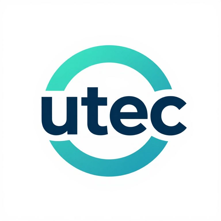 Utec logo concept blending technology and innovation, circular logo with interlocking elements, bold typography integrated in design, gradient colors of teal and cyan, sleek professional style, digital graphic design, minimal but striking