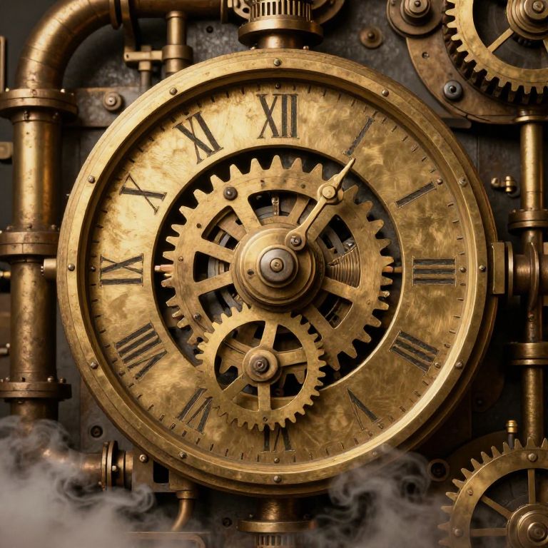 A mechanical steampunk clock with gears and cogs incorporating the number 4393087 etched into brass plates, set against a backdrop of pipes and steam, with warm sepia tones and intricate detailing.