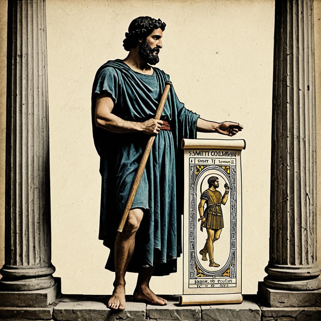 Ultra-realistic and highly detailed depiction of an ancient Greek philosopher seated and teaching his disciples in an agora setting. The scene features earthy bronze and white tones with classical Greek attire and architecture, including marble columns and steps. The philosopher is portrayed with a beard, holding a scroll, surrounded by attentive disciples seated on marble benches.