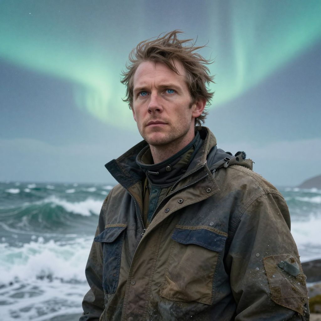 Portrait of a white male tidal researcher with piercing blue eyes and tousled hair, wearing a weathered, tattered jacket. He stands against a stormy sea backdrop, with rough waves and a misty horizon. Green auroras glow faintly in the sky, blending with his silhouette, symbolizing resilience and connection to nature's raw power. The scene evokes themes of determination and the wild beauty of northern coastal environments.