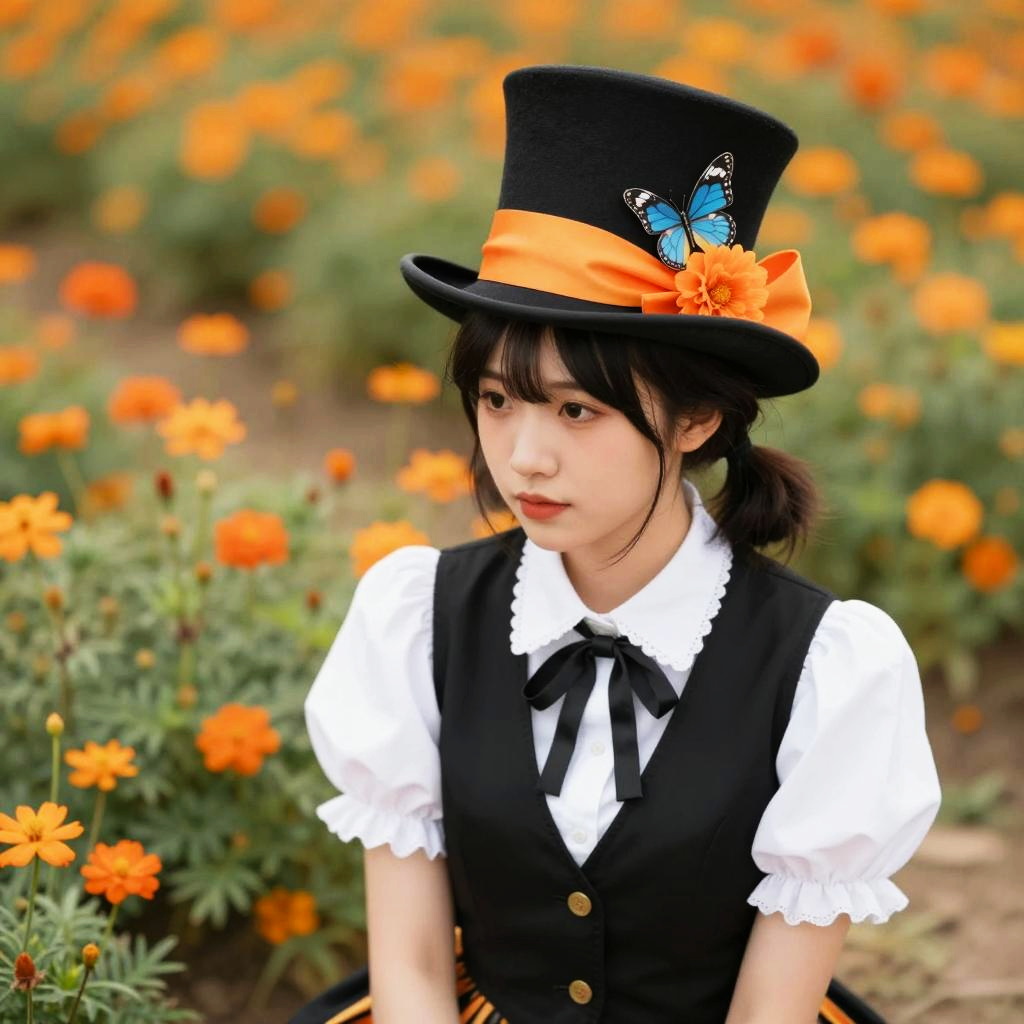 Young Asian woman wearing a vibrant Mad Hatter inspired costume, featuring a black top hat decorated with an orange ribbon, flower, and blue butterfly. She is dressed in a white blouse with puffed sleeves and a black vest, sitting in a field of bright orange flowers, evoking a whimsical and theatrical atmosphere.