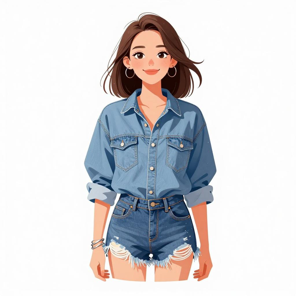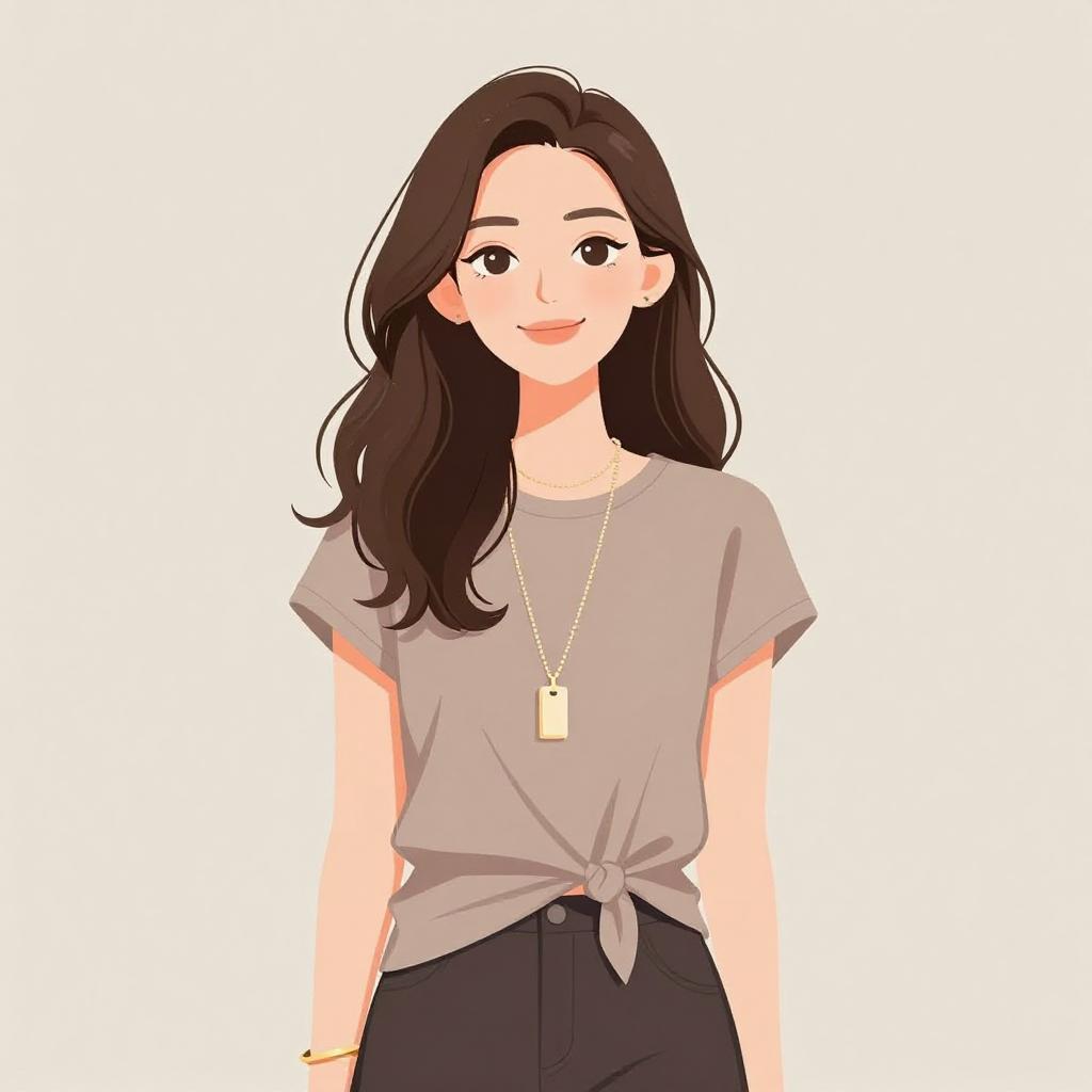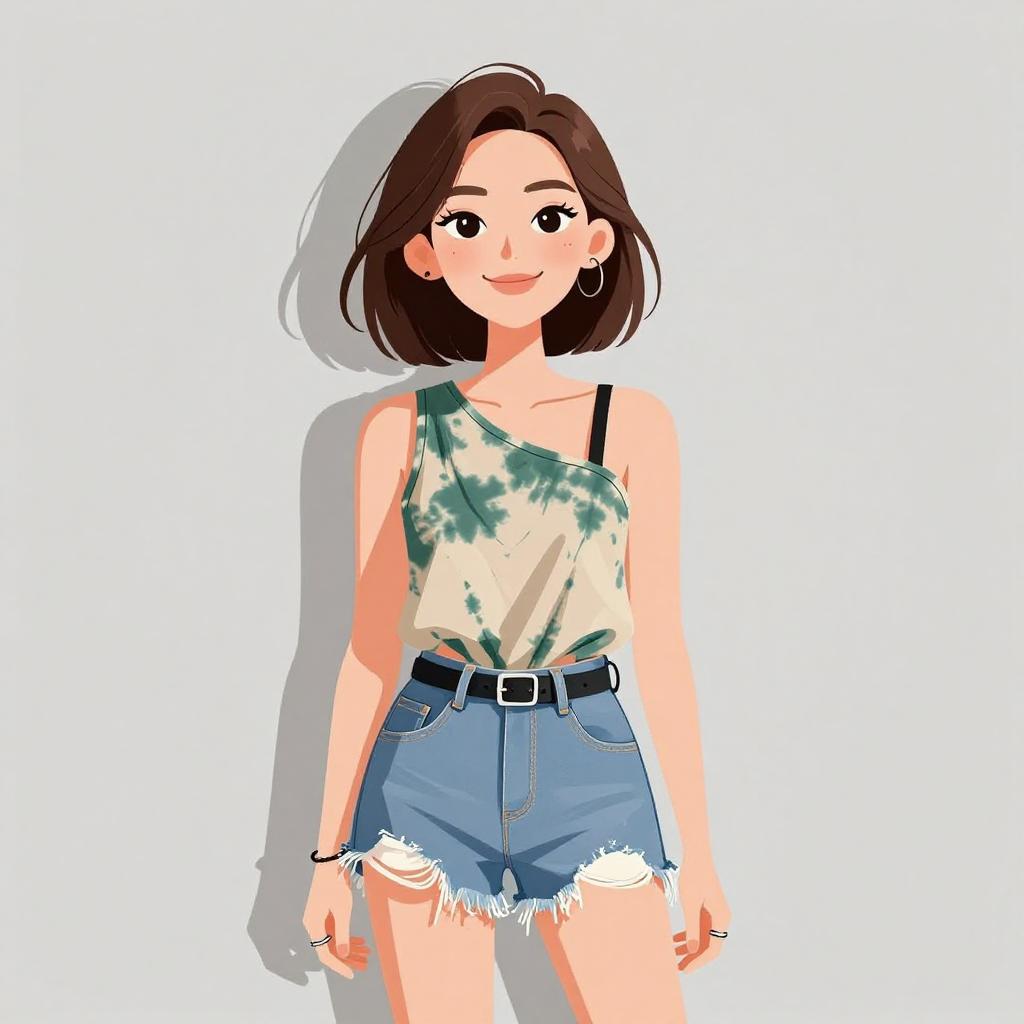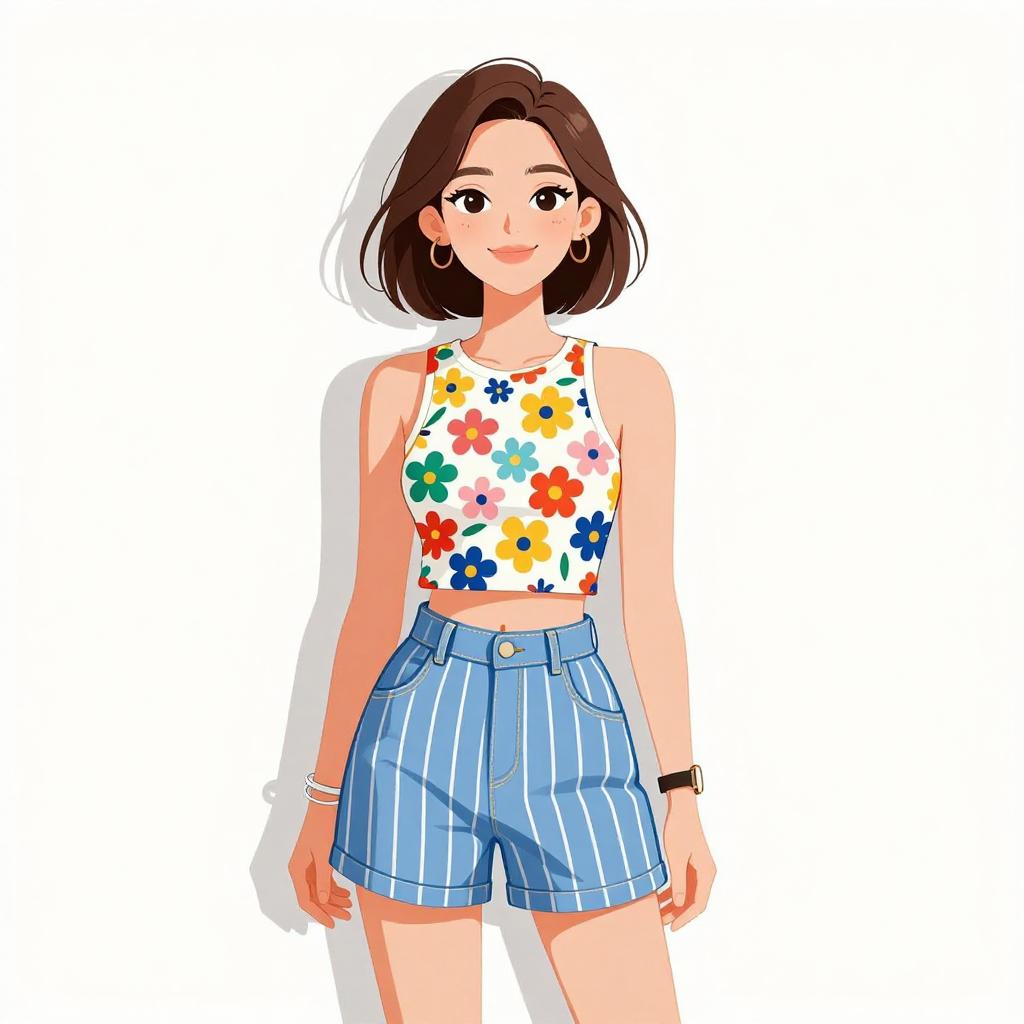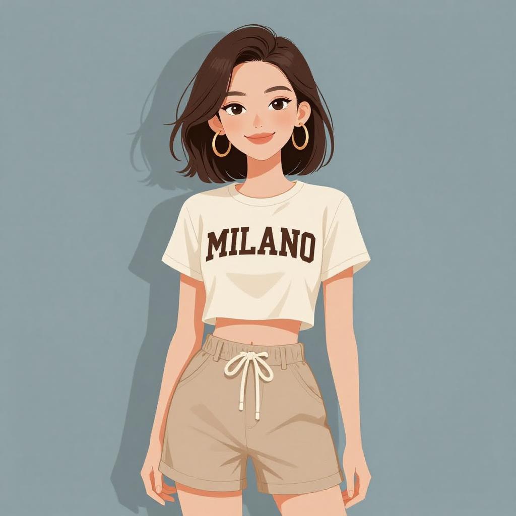 Woman with pretty face and pretty hair. smiling Woman, streetwear, cropped beige t-shirt with 'MILANO' print in brown, crew neck, short sleeves, high-waisted beige bermuda shorts with drawstring, gold hoop earrings, studio background. --sref 1467
