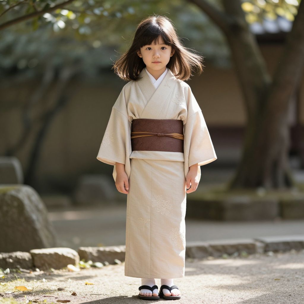 A beautiful young girl with soft brown hair flowing slightly over her shoulders, wearing a traditional beige kimono with delicate embroidery, fastened with a matching brown belt, and black sandals that add a touch of elegance and contrast. She stands gracefully in a serene outdoor setting, sunlight gently filtering through the trees, giving her a peaceful and authentic Japanese-inspired atmosphere.