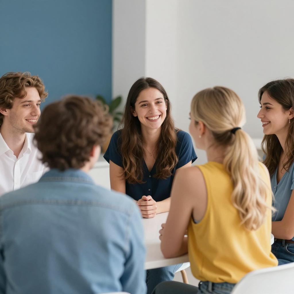 Group of seven young adults seated in rows, dressed in business and smart casual attire. Central bald man wearing a gray suit, black tie, and glasses holds a blue book. Woman on the left wears a brown jacket over a white blouse, holding a brown purse and resting her hand near her mouth. Man on the right in a gray suit with a navy sweater underneath has arms crossed, holding a green book. Others in the background wear varied business casual clothing, sitting against a plain white backdrop.