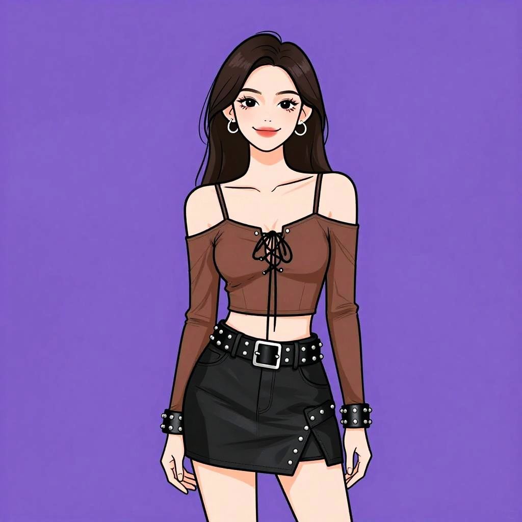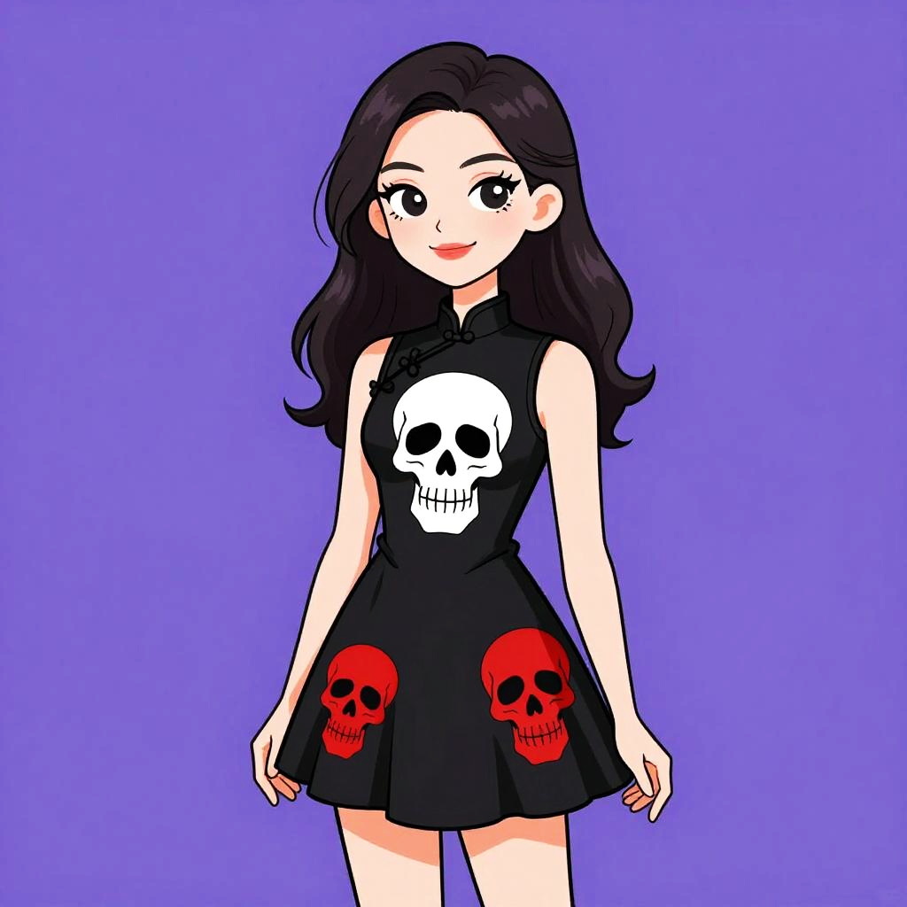 Digital anime-style drawing of a smiling young woman with long black hair, wearing a black dress with a skull and red skull prints, against a solid purple