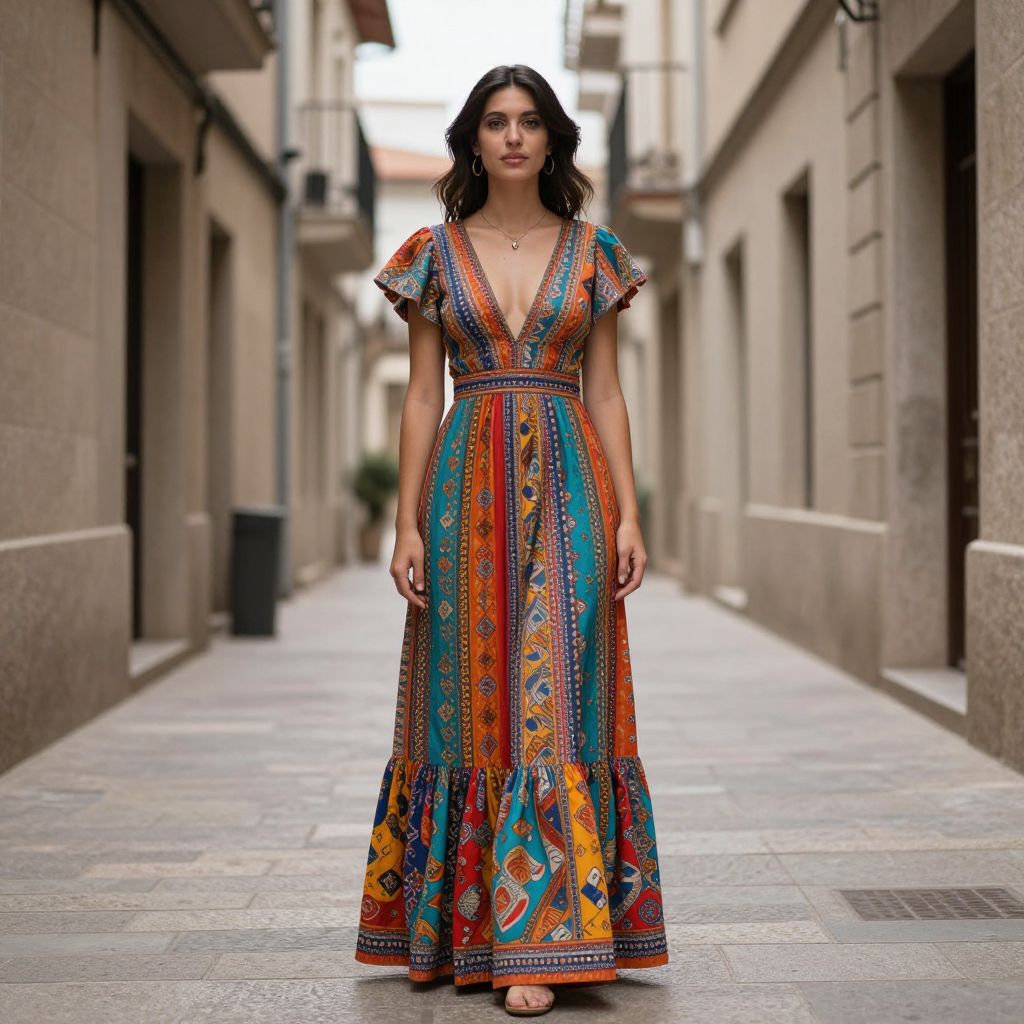 Photograph of a young woman standing in a narrow, urban alleyway. She has wavy, dark brown hair and a light olive skin tone. She is wearing a vibrant, V-neck, ankle-length dress with short sleeves, featuring a colorful, intricate pattern with dominant shades of orange, blue, and red. The dress has a fitted bodice and a flowing skirt. She stands confidently, looking directly at the camera. The alleyway has beige stone walls on both sides, with some windows and a black trash bin visible in the background. The ground is paved with grey tiles.