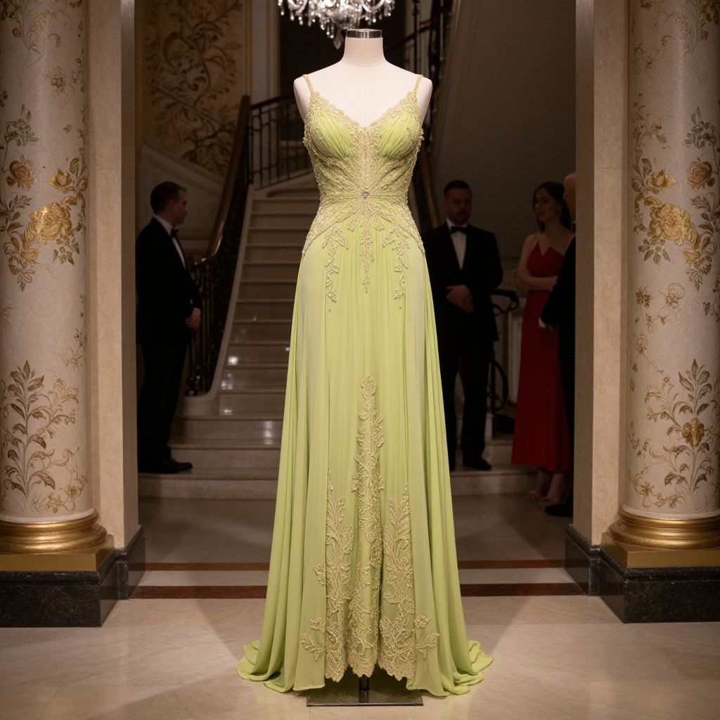 Photograph of a floor-length, sleeveless, light green evening gown displayed on a mannequin in an elegant setting. The gown features intricate lace detailing along the bodice and lower skirt, with a slightly flared, flowing design. The background shows a grand staircase with ornate, gold-patterned wallpaper and two people, a man in a black suit and a woman in a red dress, standing on the stairs. The gown is centered in front of two tall, decorative columns with gold accents. The lighting highlights the gown's delicate lacework and the luxurious setting.