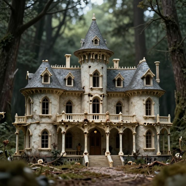 A haunting, ultra-realistic mansion made of bones, resembling H.R. Giger's style, stands in the woods with a shallow depth of field, creating a creepy and eerie atmosphere.