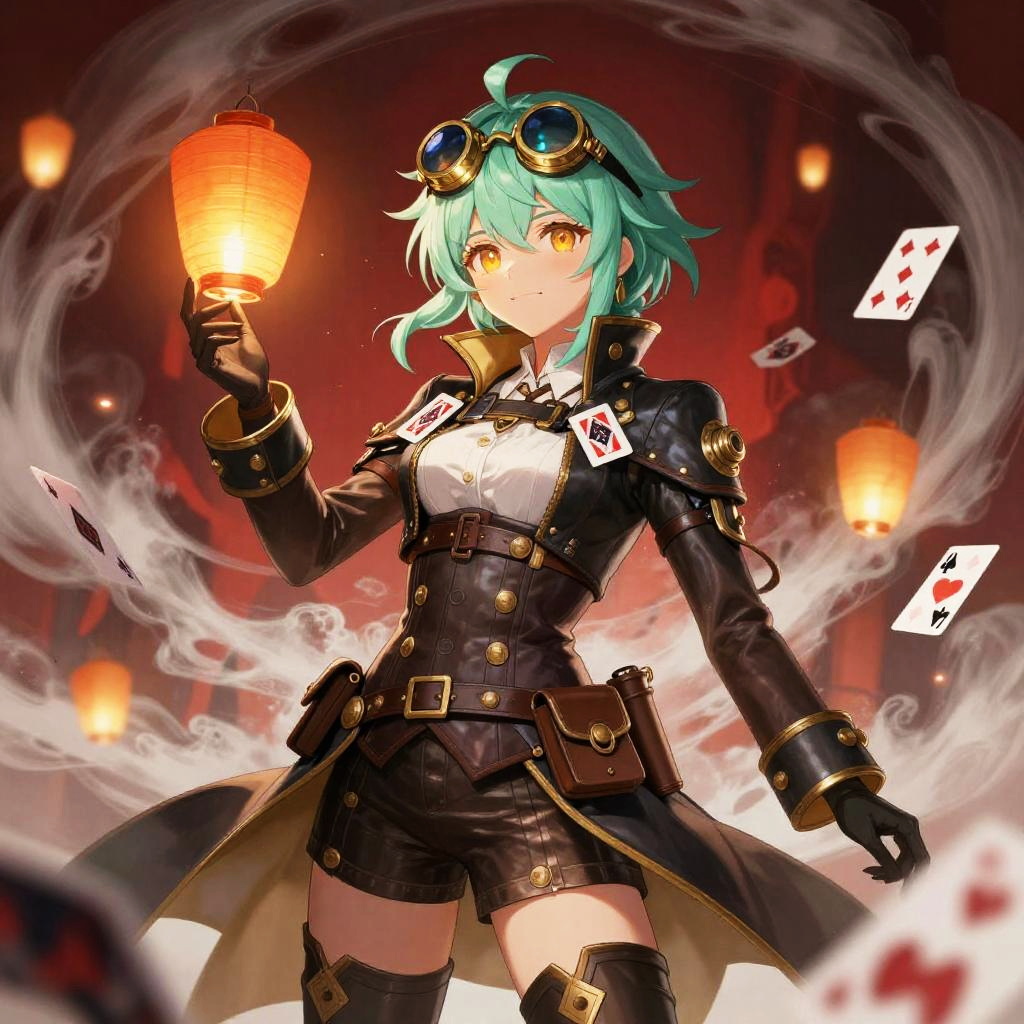 Anime-style female character with mint green hair and amber eyes, dressed in a detailed steampunk tailcoat with brass goggles and layered belts. She holds two miniature glowing lanterns while surrounded by floating playing cards in a dynamic, smoky atmosphere with red and white highlights. The digital artwork features sharp expressive eyes, intricate costume details, and vibrant colors.