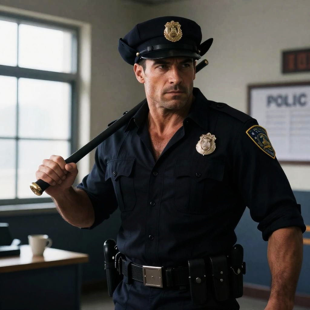 Realistic, masterpiece, best quality, cinematic lighting, natural shadow, highest detail, professional photography, detailed background, depth of field, insane details, intricate, aesthetic, detailed face, subsurface scattering, realistic hair, realistic eyes, muscular, masculine, large pectorals, photo of a handsome man, (40 year old), body hair, black-color, open clothes, shirt, belt, pants, baton, police station, hat, dynamic pose, office, window