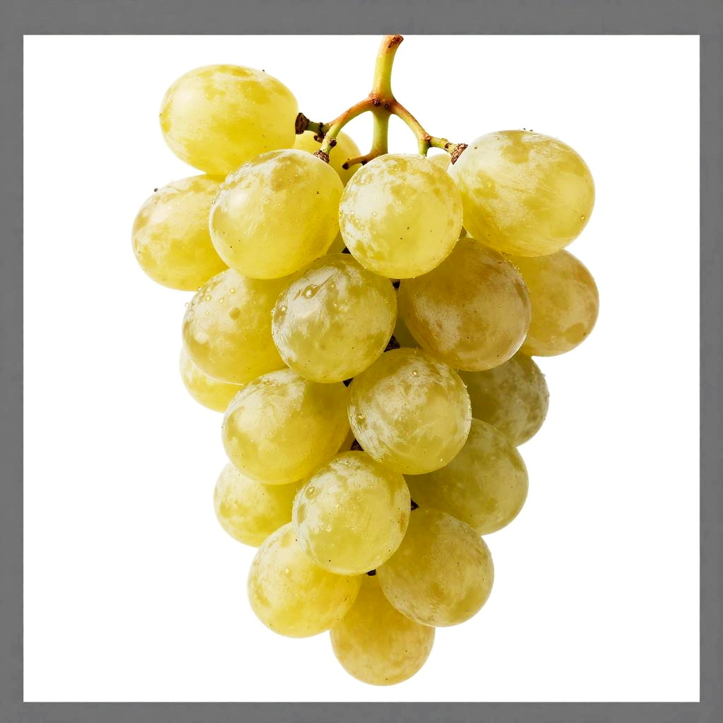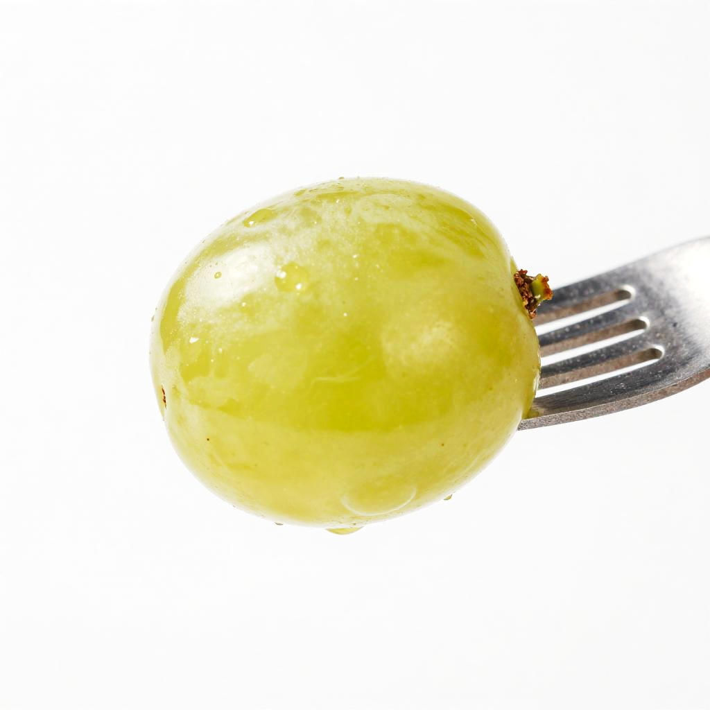 This is a close-up digital image of a single greenish-yellow grape being pierced by a black-tipped fork. The grape has a shiny, slightly textured surface and is centered against a stark white background, with the fork's prongs and handle extending from the right side of the image. The lighting highlights the grape's round shape and smooth texture.