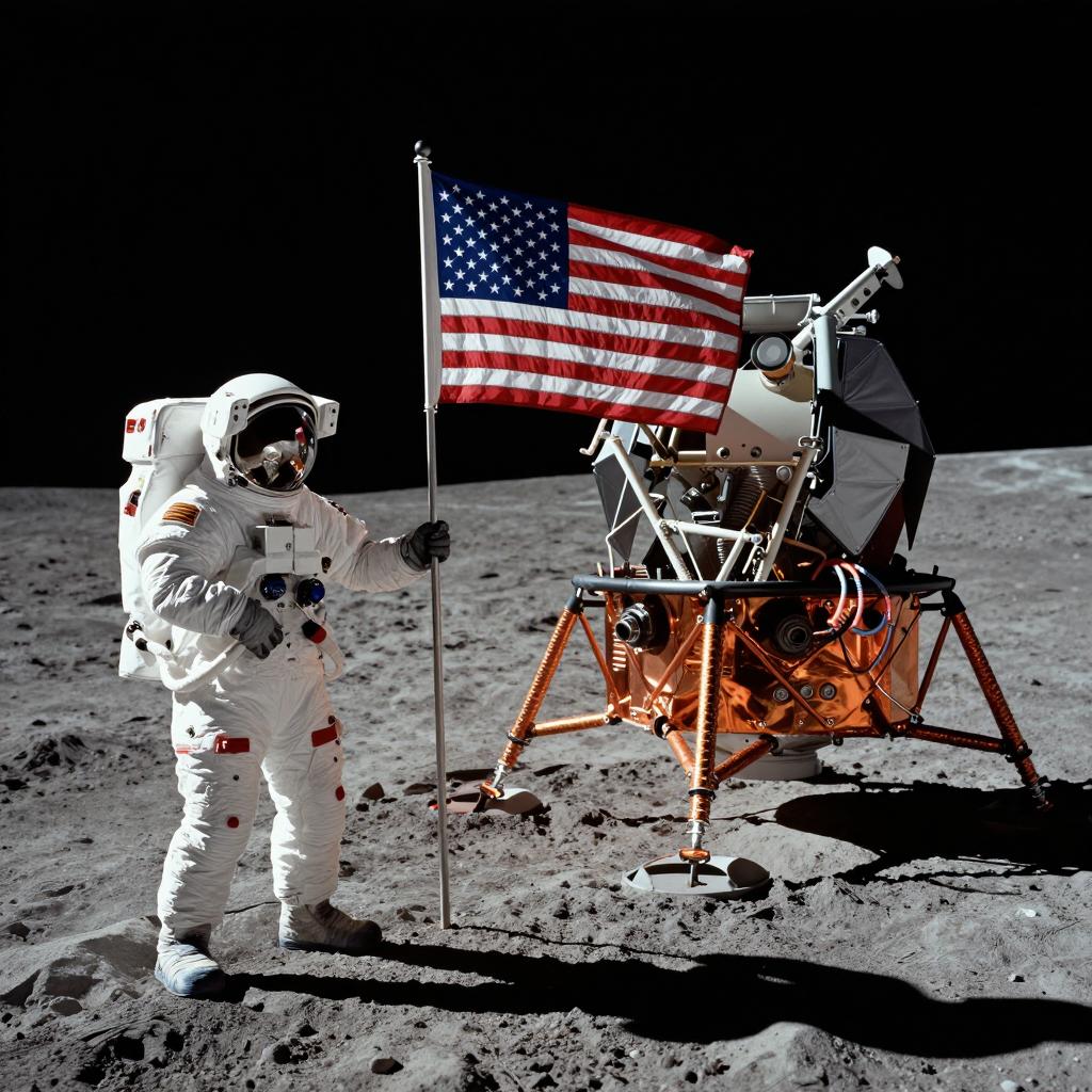 Astronaut in white spacesuit with helmet, standing on lunar surface, left side. American flag on pole, center. Robotic lunar module with antennas and wires, right of flag. Sunshade, right side. Gray lunar terrain and dark sky background.