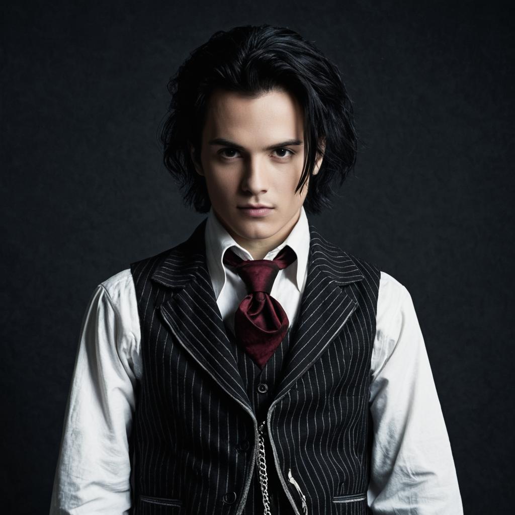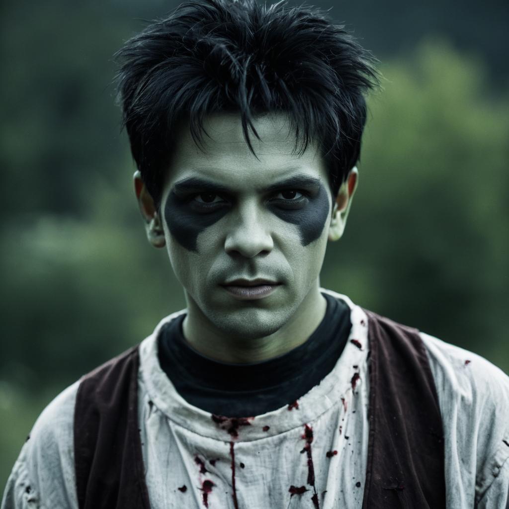 Portrait of a young man dressed as a Frankenstein-style zombie with black hair and black makeup around his eyes. He wears a torn and bloodstained white shirt with a dark vest, standing against a blurred outdoor green background. His expression is serious, and his skin has a pale, colored effect consistent with a zombie look.
