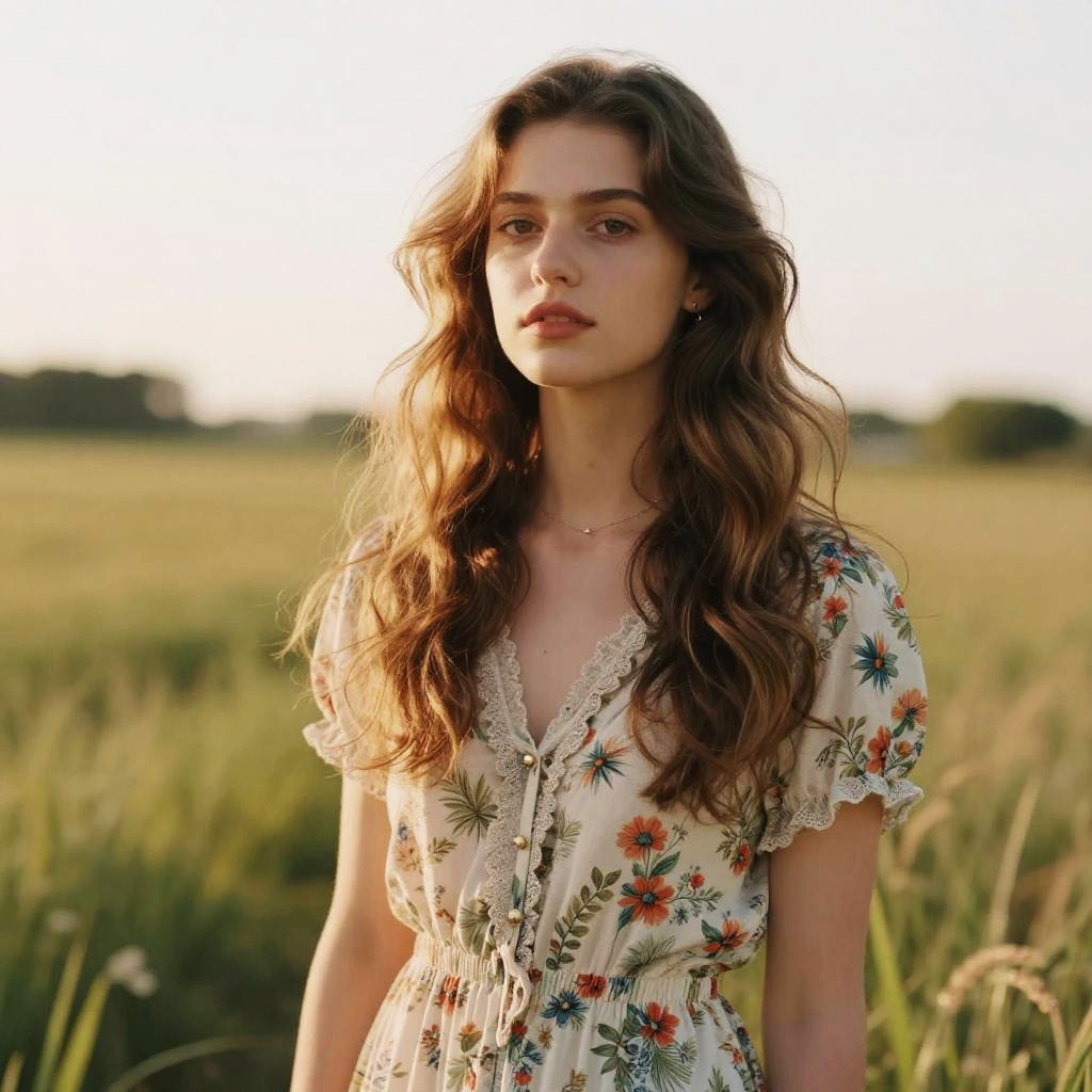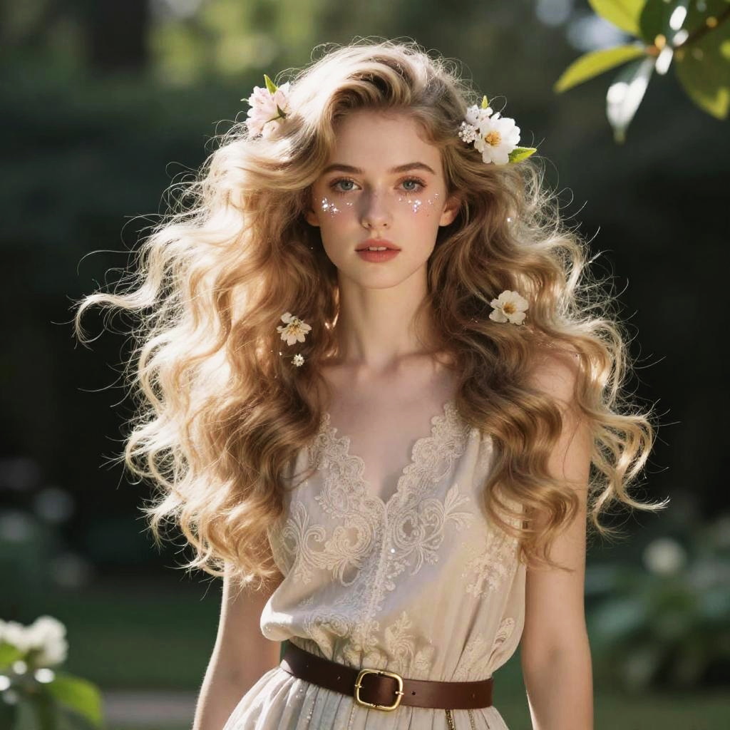Femboy transformation with flowing hair, floral motifs, sparkling eyes, elegant and stylish fashion, ethereal lighting, surreal garden setting, blending masculinity and femininity