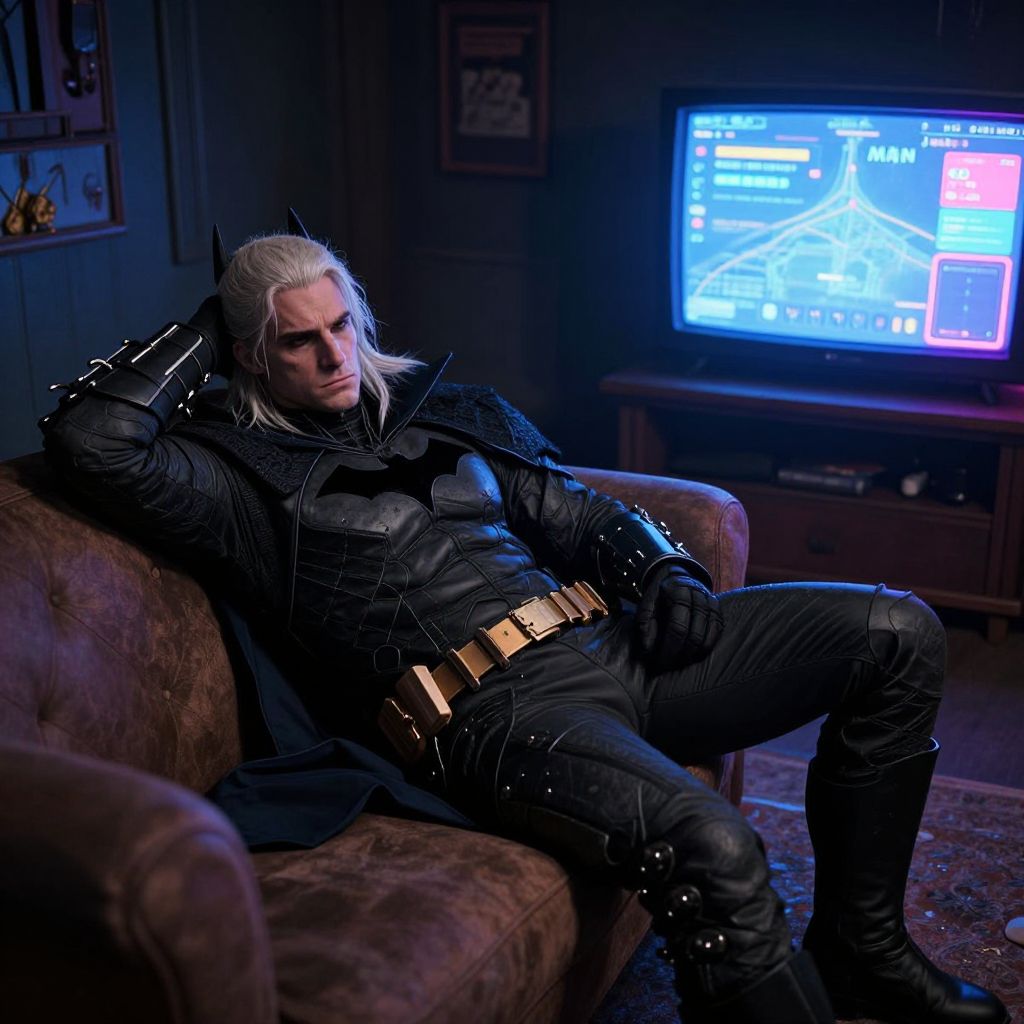 A witcher batman lying on couch front of tv, depressed, vibrant, life changing, dramatic, cinematic lighting, digital art, ultra sharp, extreme details