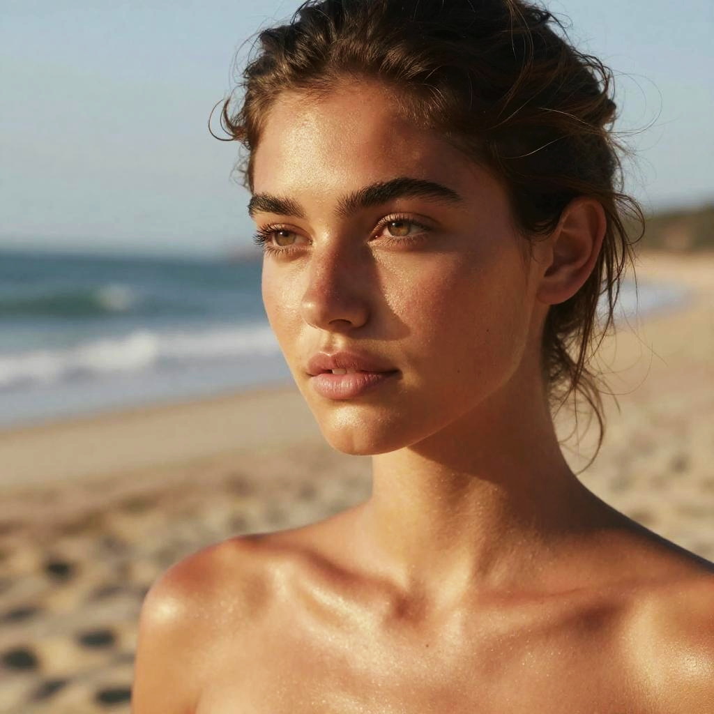 Tanned complexion portrait of a young woman with sun-kissed skin, golden highlights, soft natural lighting, beach background, photorealistic style