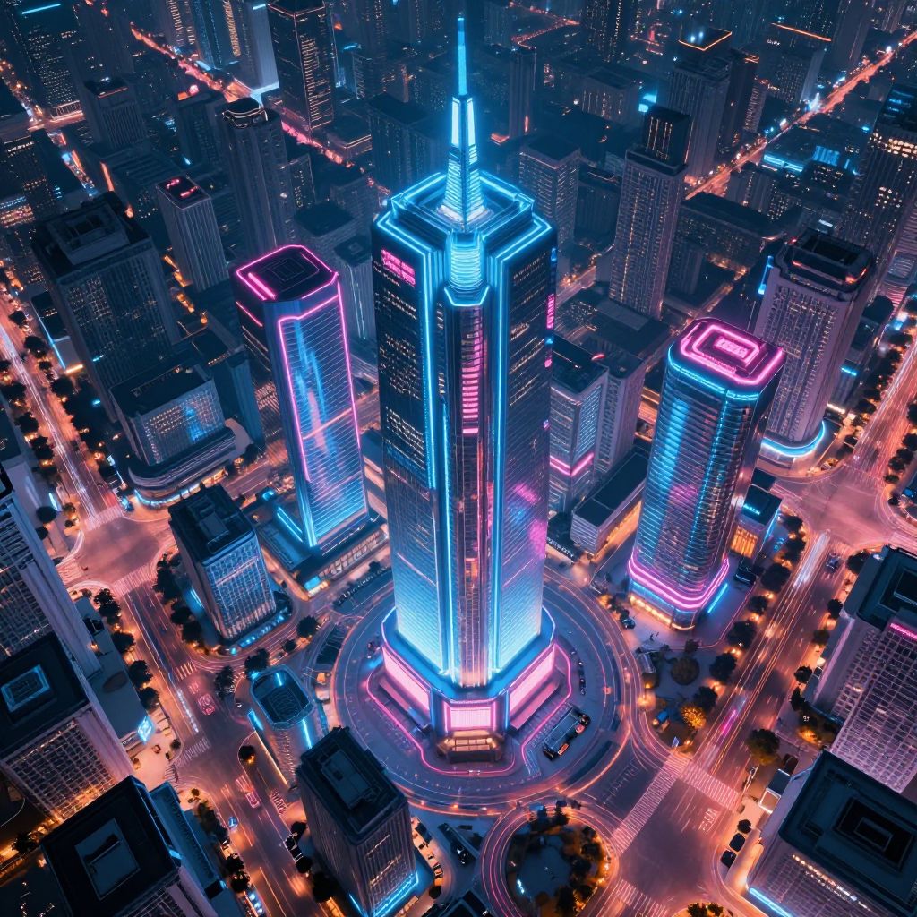 Aerial photograph of a neon-lit cityscape featuring a central skyscraper with glowing blue and pink lights, surrounded by illuminated buildings and busy streets.