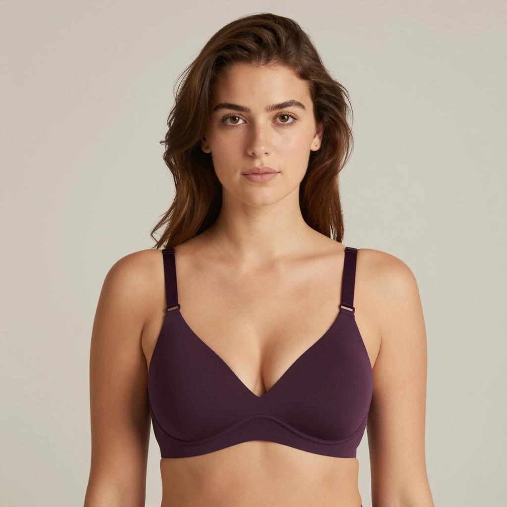 Portrait of a young woman with long, straight brown hair wearing a maroon bra with lace trim and a light gray cardigan. She has a neutral, calm expression with her mouth slightly open, looking to the side. The background features large beige floral patterns. The soft lighting highlights the delicate textures of the clothing and her natural skin tone.