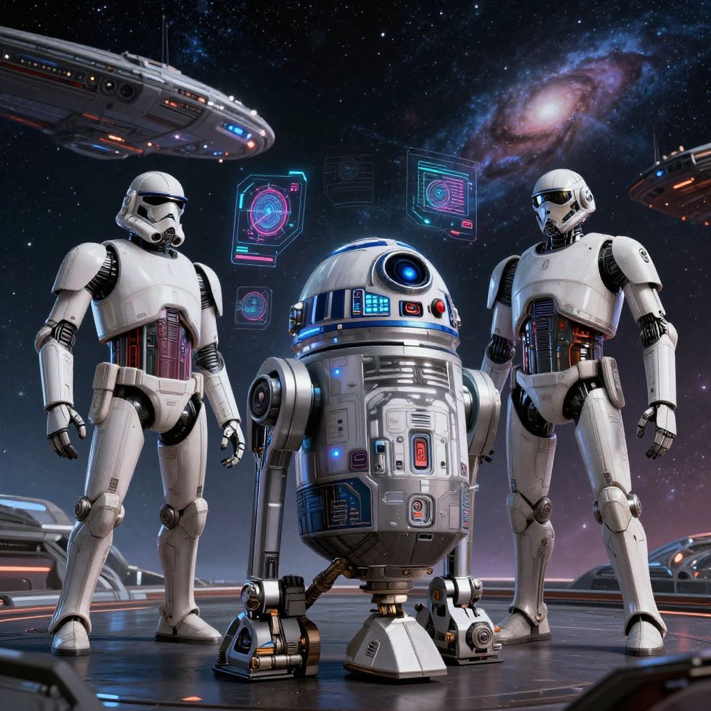 Star Wars AI art generator visualizes a serene moment with a droid repairing ancient Jedi artifacts inside a dimly lit temple, glowing holograms floating, intricate stone textures, ambient light beams piercing through cracks in the walls.