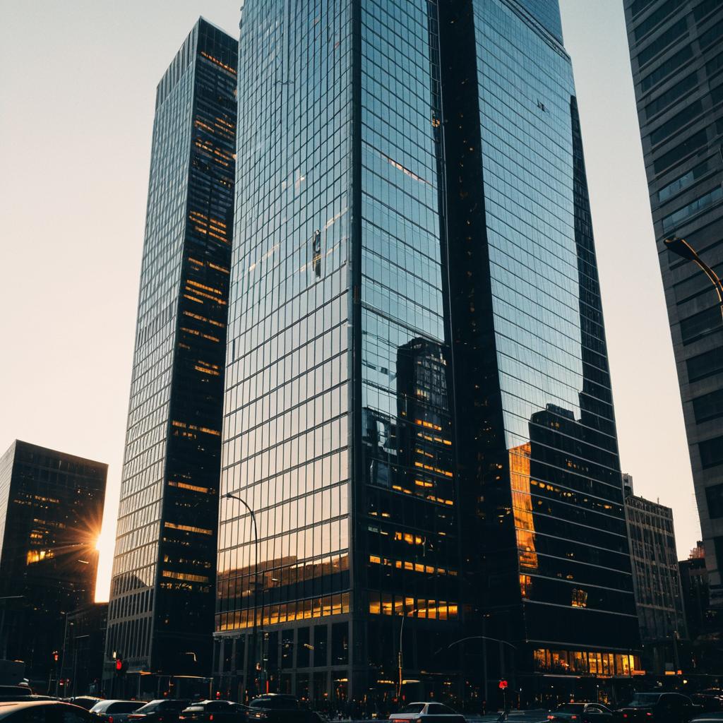 Photograph of a sleek, modern skyscraper with reflective glass windows in a busy metropolitan downtown area. The building's facade showcases sharp, elegant architectural lines, highlighted by warm sunlight during golden hour. Surrounding buildings partially visible, adding context to the urban environment.