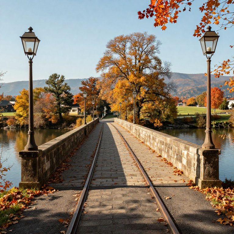 Tramway crossing an old stone bridge over a calm river in autumn, with colorful falling leaves, rustic lampposts lining the route, and mountains far in the distance under a clear sky, perfect for a warm, nostalgic scene.