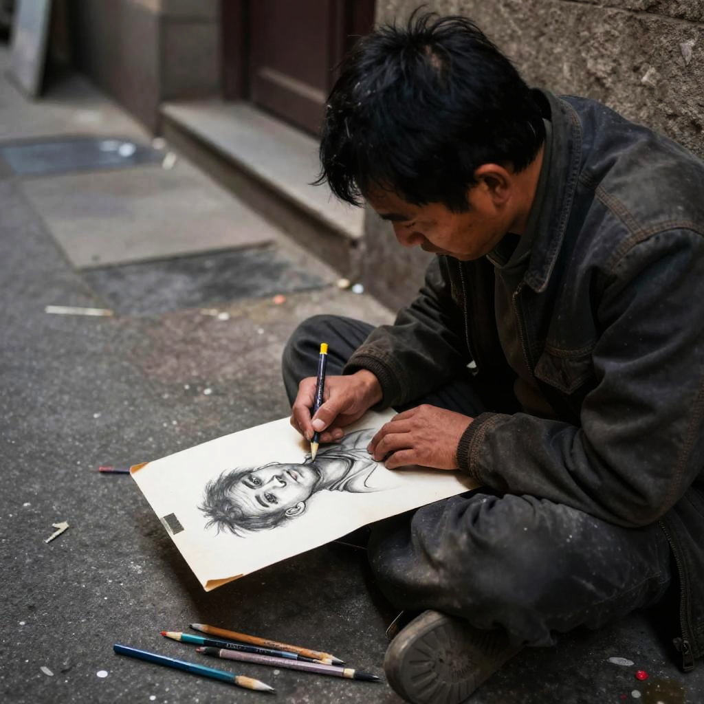 Homeless man drawing portraits with charcoal on old paper, surrounded by scattered art supplies in a dimly lit alley, gritty and heartwarming atmosphere