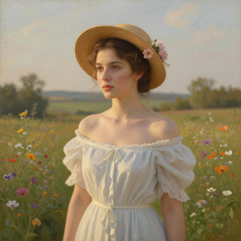 A serene oil painting by Emile Vernon captures a young woman in a pastoral setting, adorned with a straw hat decorated with delicate pink flowers, wearing a vintage off-the-shoulder dress, set against a lush backdrop of blooming wildflowers and a tranquil countryside under golden-hour lighting.