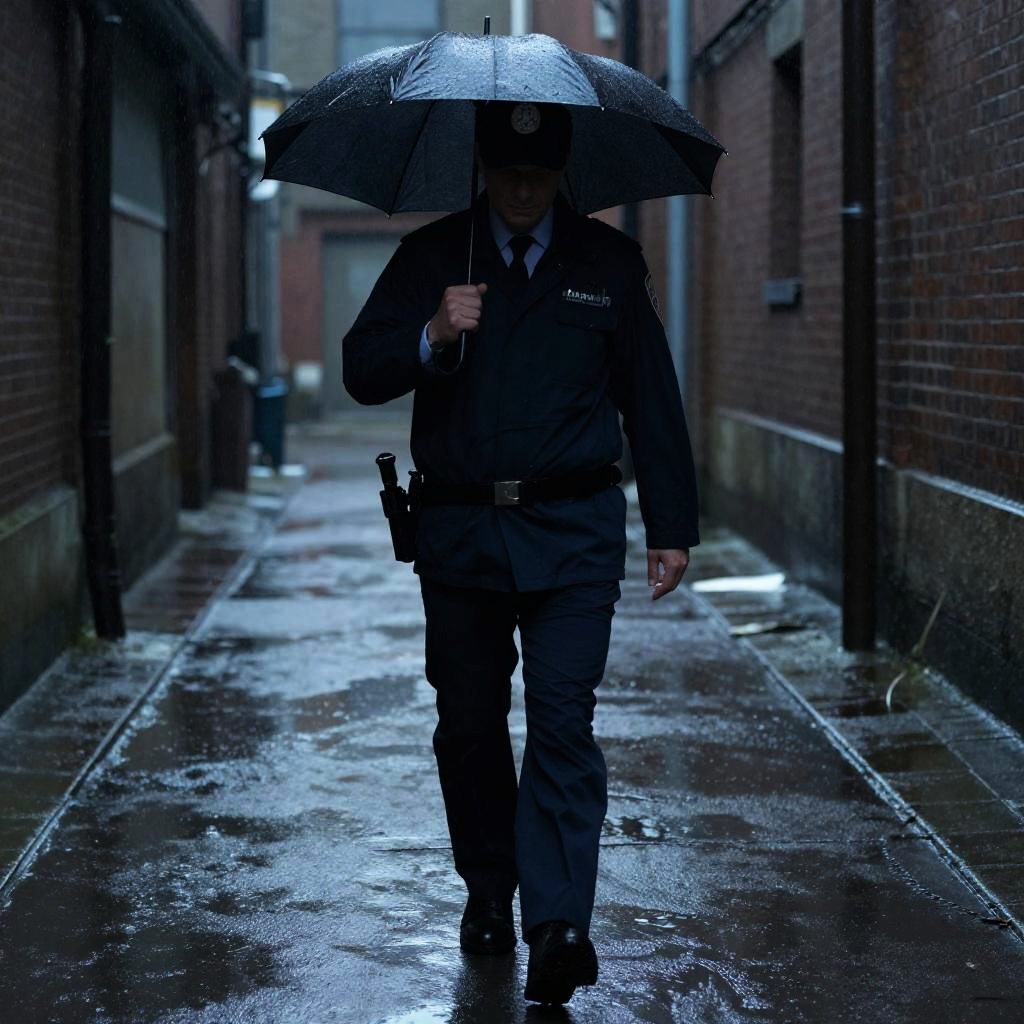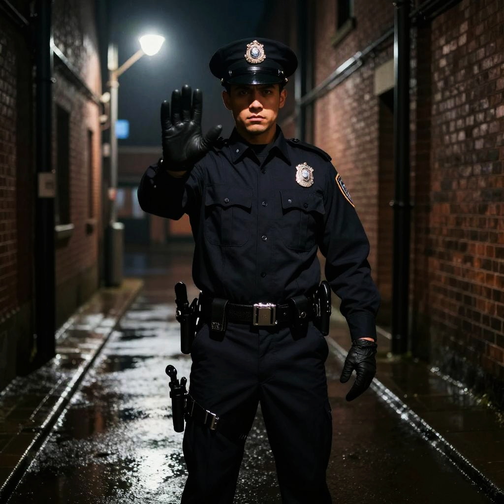 Photograph of a serious male police officer in dark uniform, black gloves, hat, and utility belt, standing in a wet alley at night, raising