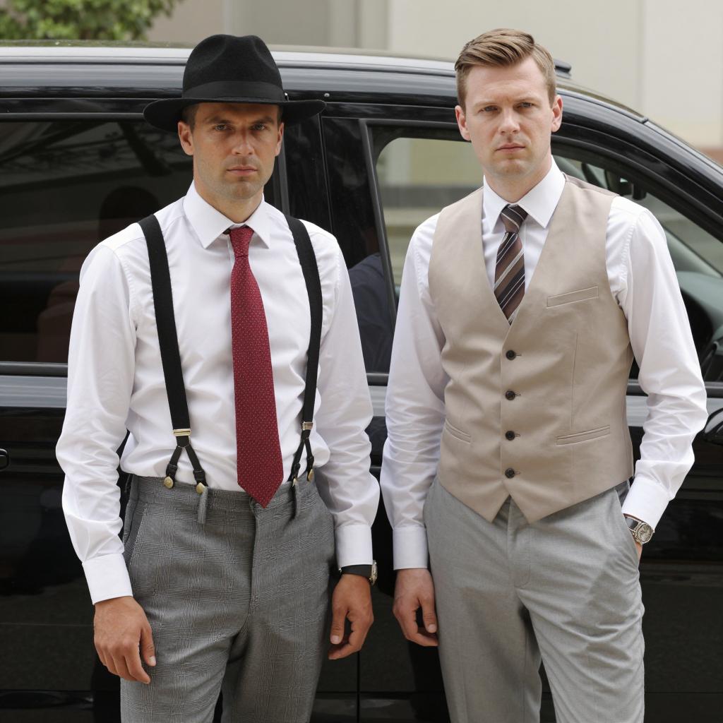 Two men standing beside a black car. Both wear white shirts, suspenders, and ties. The man on the left has dark hair, a red patterned tie, and dark pants. The man on the right has light brown hair, a brown vest, and gray pants. The car's interior is visible, with a steering wheel on the right. The background is blurred.