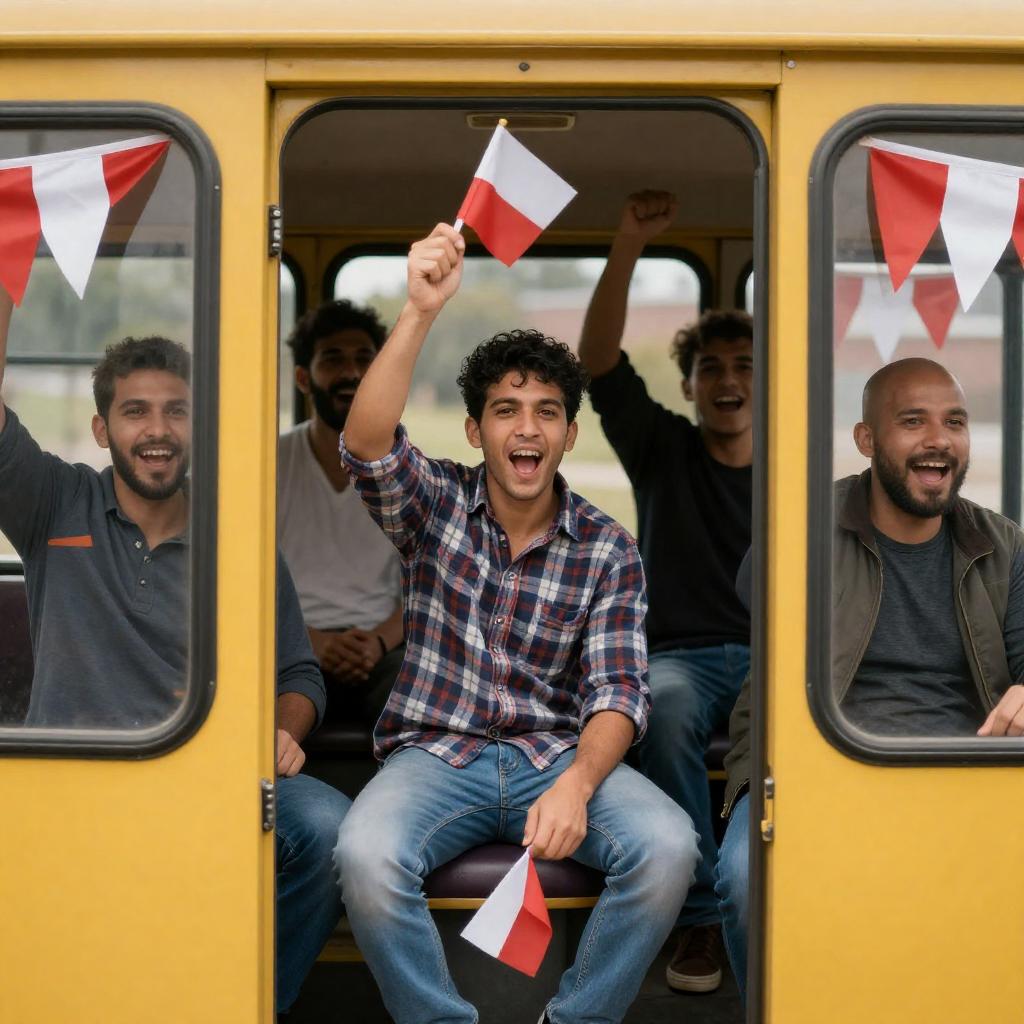Photograph of six men sitting inside a yellow bus, energetically cheering and holding red and white flags. They wear casual clothes, including plaid shirts and jackets. The man in the center has dark curly hair, while the man on the right is bald. Red and white bunting decorates the bus windows.