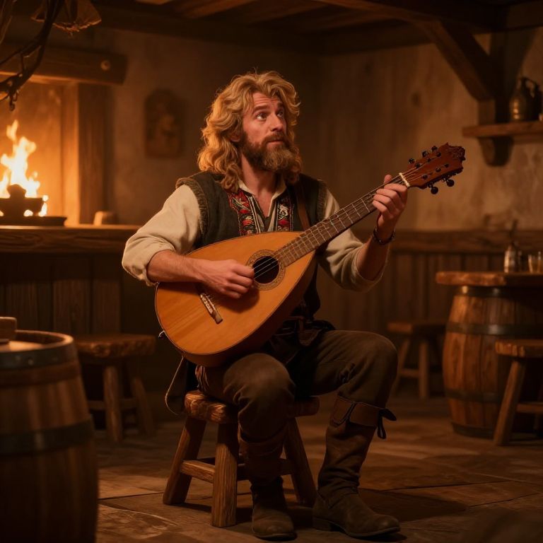 Photograph of a bearded man with long, curly blonde hair playing a wooden lute in a dimly lit, rustic tavern. Warm candlelight
