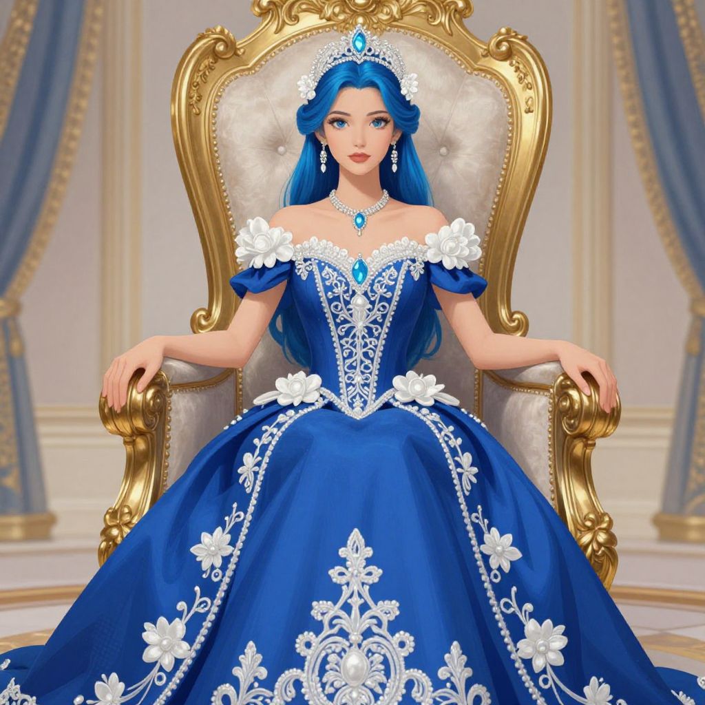 This elegant illustration features a woman seated on a lavish throne, adorned in a stunning blue gown with intricate white details and floral embellishments. Her striking blue hair and delicate accessories enhance the regal atmosphere, making the artwork captivating and visually rich.