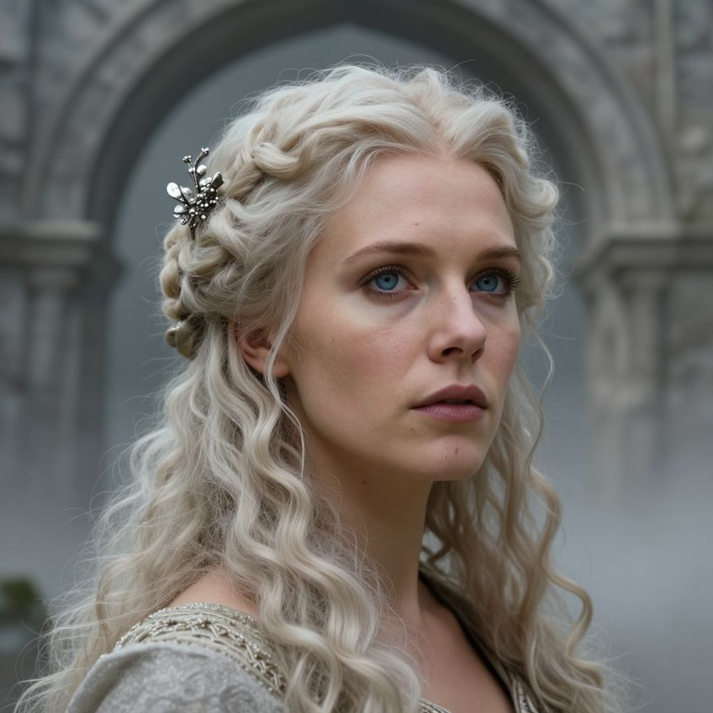Create a high-resolution digital painting featuring a Nordic woman with tranquil blue eyes and long, curly platinum blonde hair styled in an intricate updo adorned with delicate silver floral details. Soft lighting highlights her porcelain skin, revealing subtle freckles and a faint scar above her lip. Her expression, as she gazes into the distance, conveys a blend of nostalgia and determination. The ethereal mist enveloping an ancient stone archway behind her hints at a mysterious past while symbolizing hope for the future.