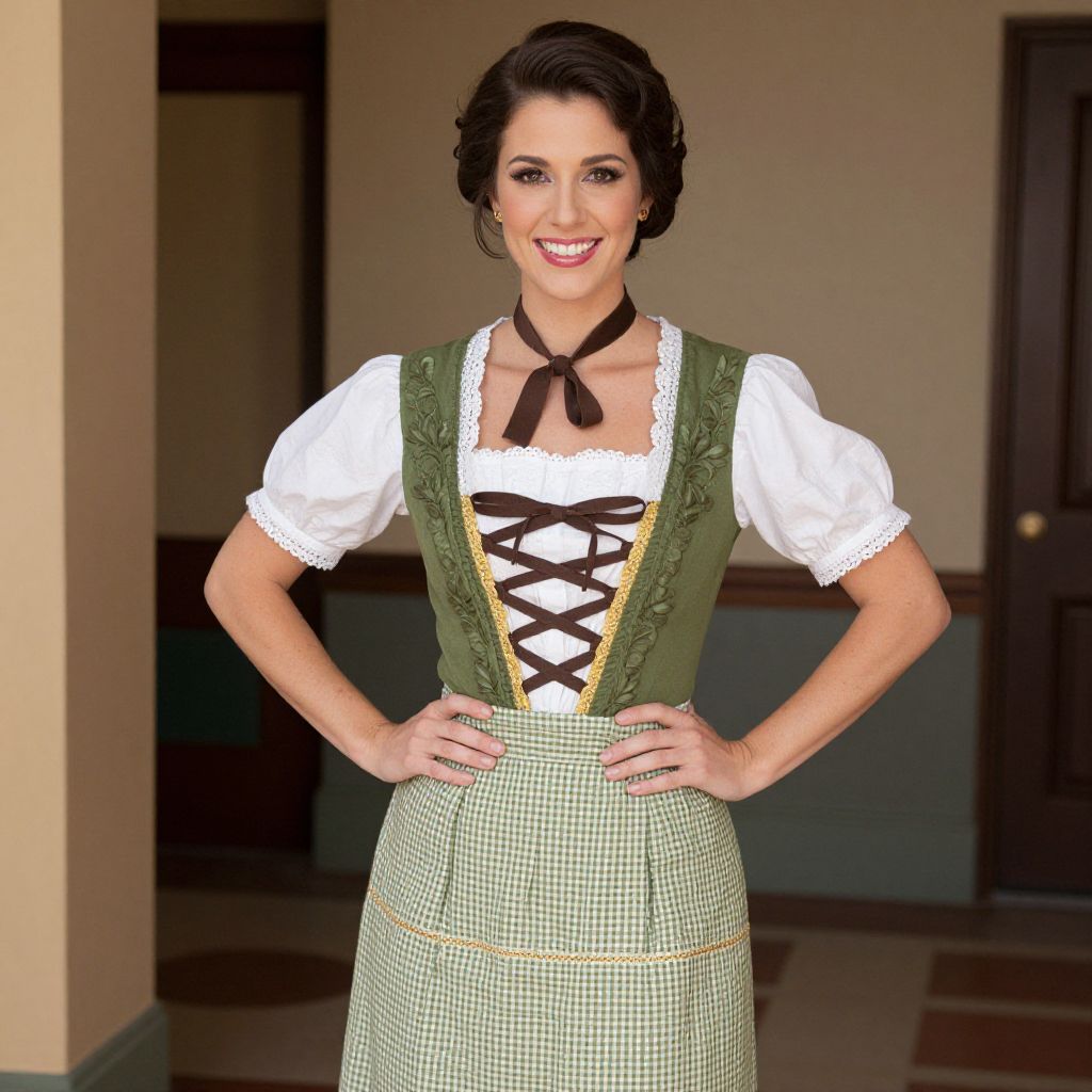 Photograph of a smiling woman with fair skin and dark brown, wavy hair styled in a vintage updo. She wears a traditional German dirndl dress with a green and white checkered skirt, a white blouse with puffed sleeves, and a green bodice adorned with black lace-up detailing and a black ribbon tied at the neckline. Her hands rest on her hips, and she stands in a dimly lit room with beige walls and dark wood doors in the background. The lighting highlights her bright red lipstick and cheerful expression.