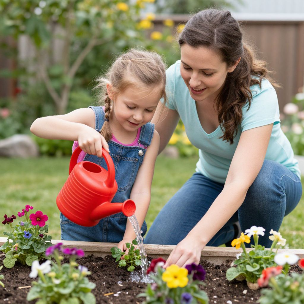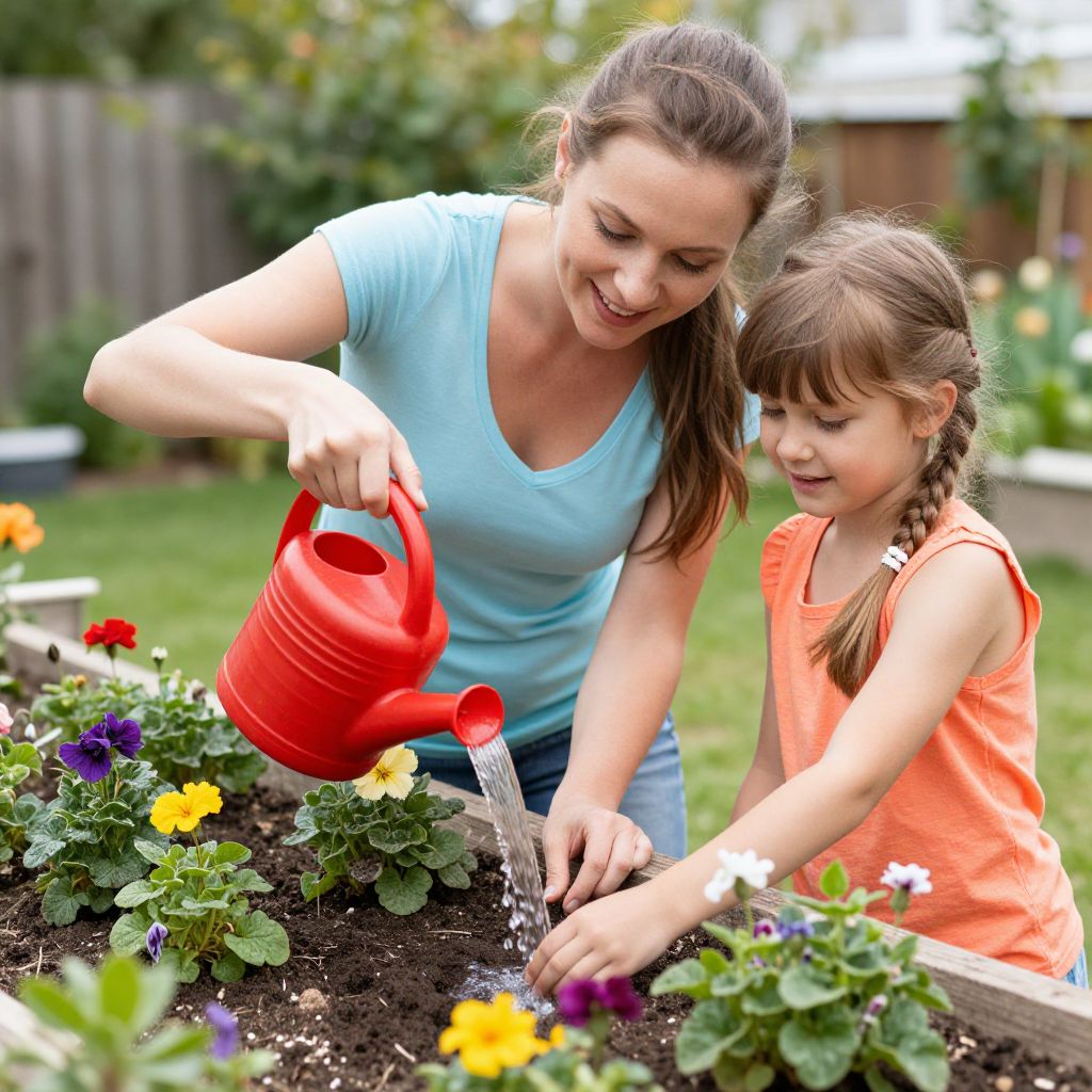Woman and child engaging in organic gardening together in a vibrant backyard, with the girl holding a red watering can and gently pouring water onto a small garden bed surrounded by colorful flowers and greenery.