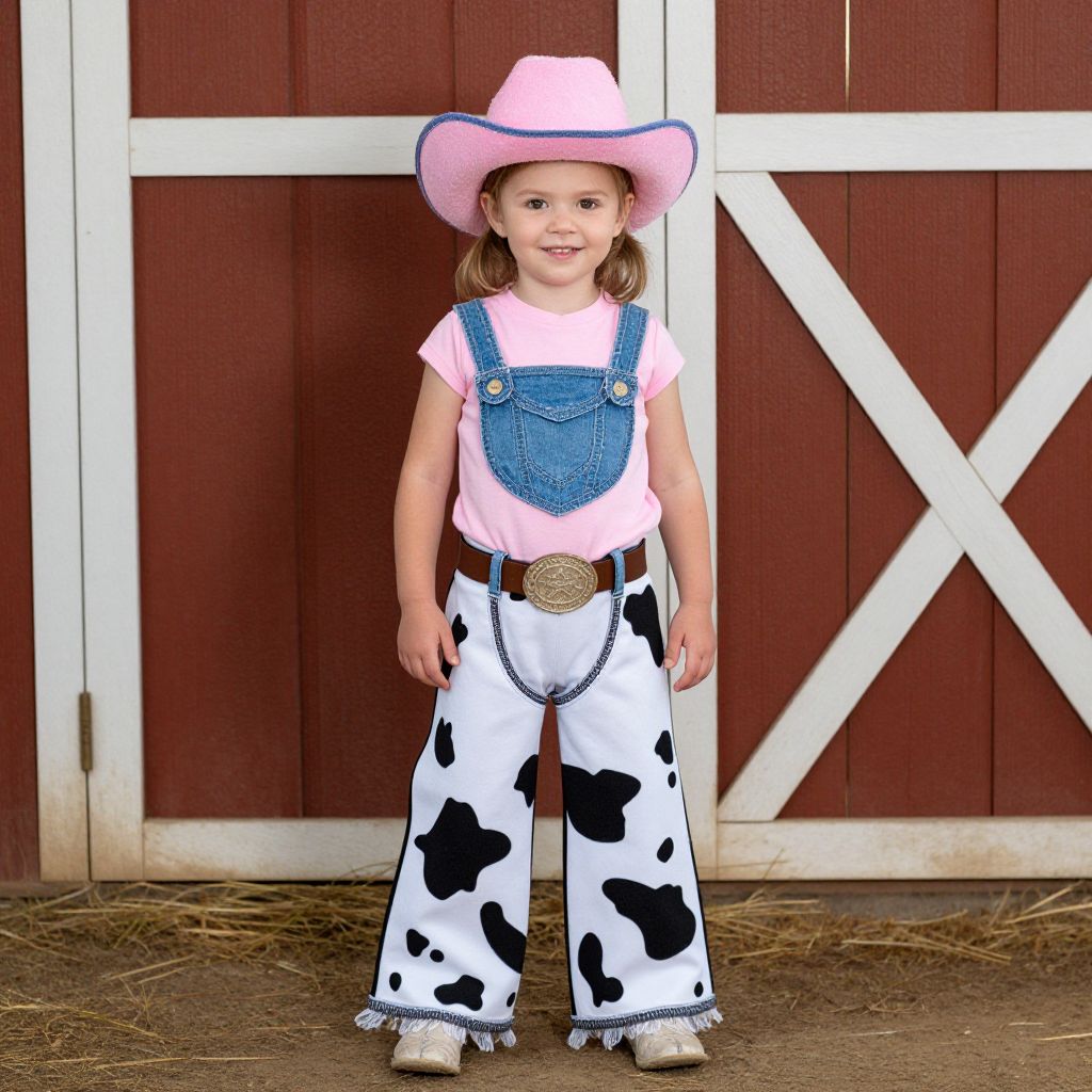Photograph of a young girl in a pink cowboy hat, blue denim vest, cow-print pants, and western boots, standing in front of a red