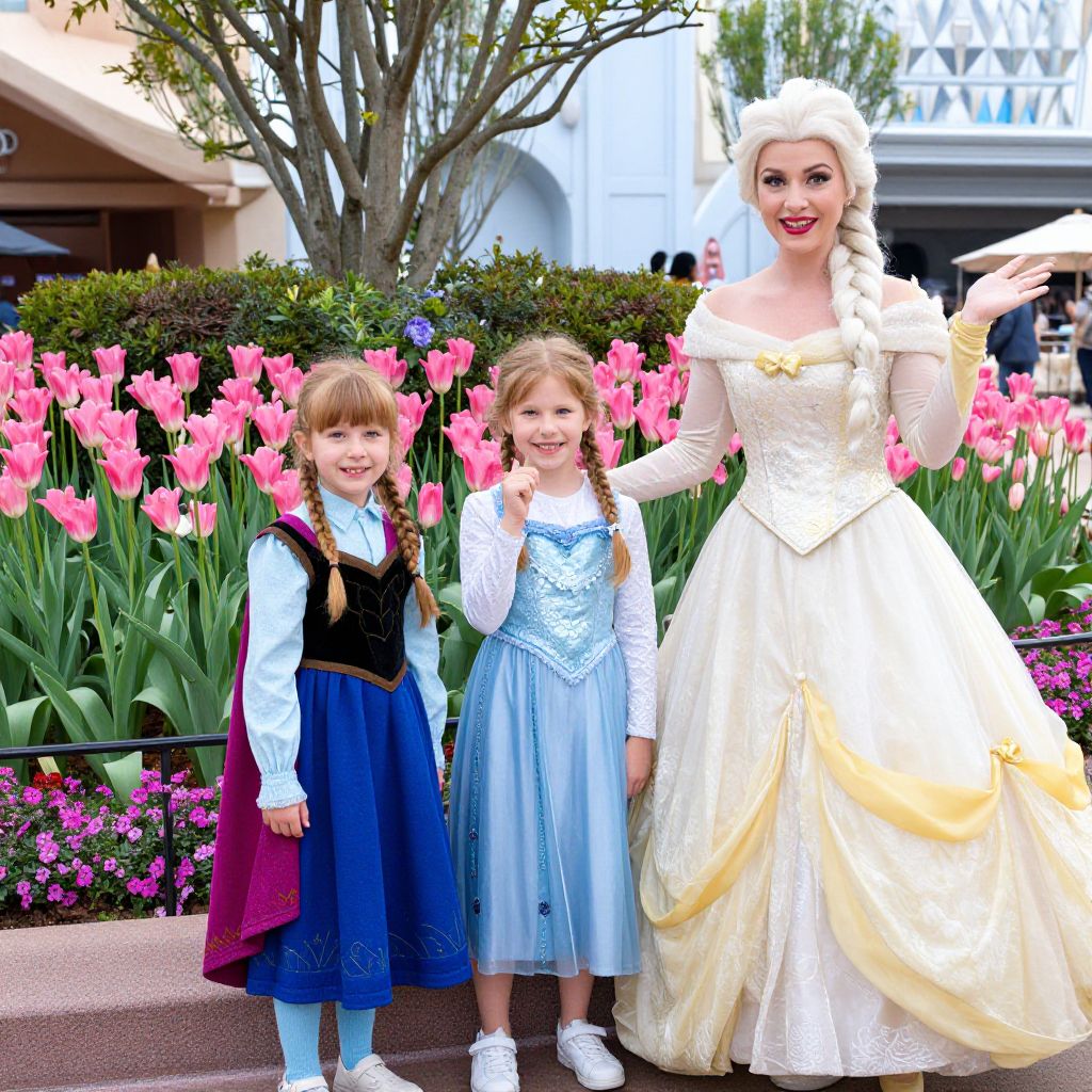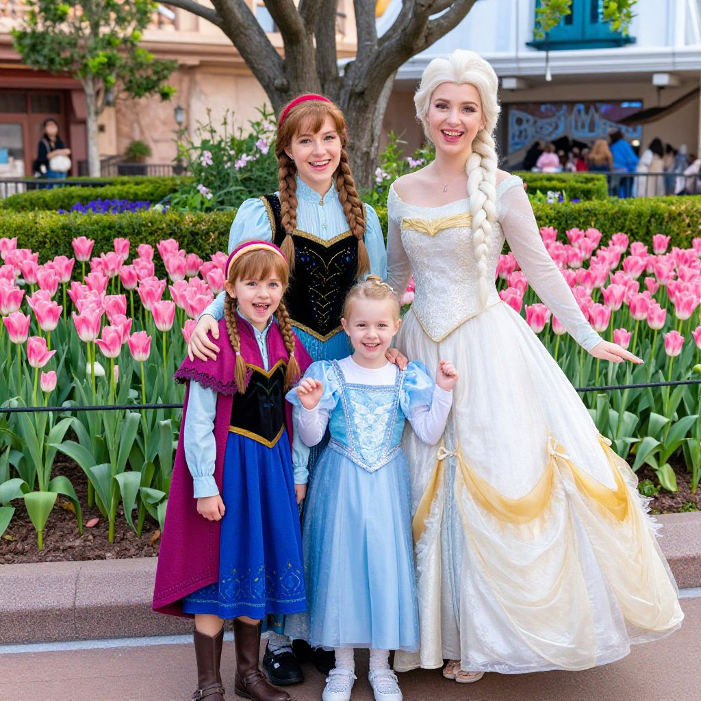 Family dressed in Disney-inspired costumes—two girls in Anna and Elsa outfits and a woman in a Belle gown—pose together joyfully in front of vibrant pink tulips and neatly trimmed hedges at Epcot.