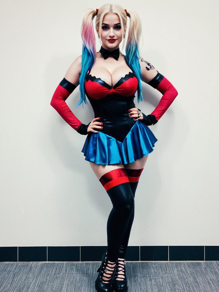 Photo-realistic cosplay photo of person in harley quinn costume. Full body. Standing. Full length. 1girl, red lips, blue eyes, blonde hair, blue hair, long hair, pink hair, gradient hair, twintails, large breasts, medium breasts, nail polish, lipstick