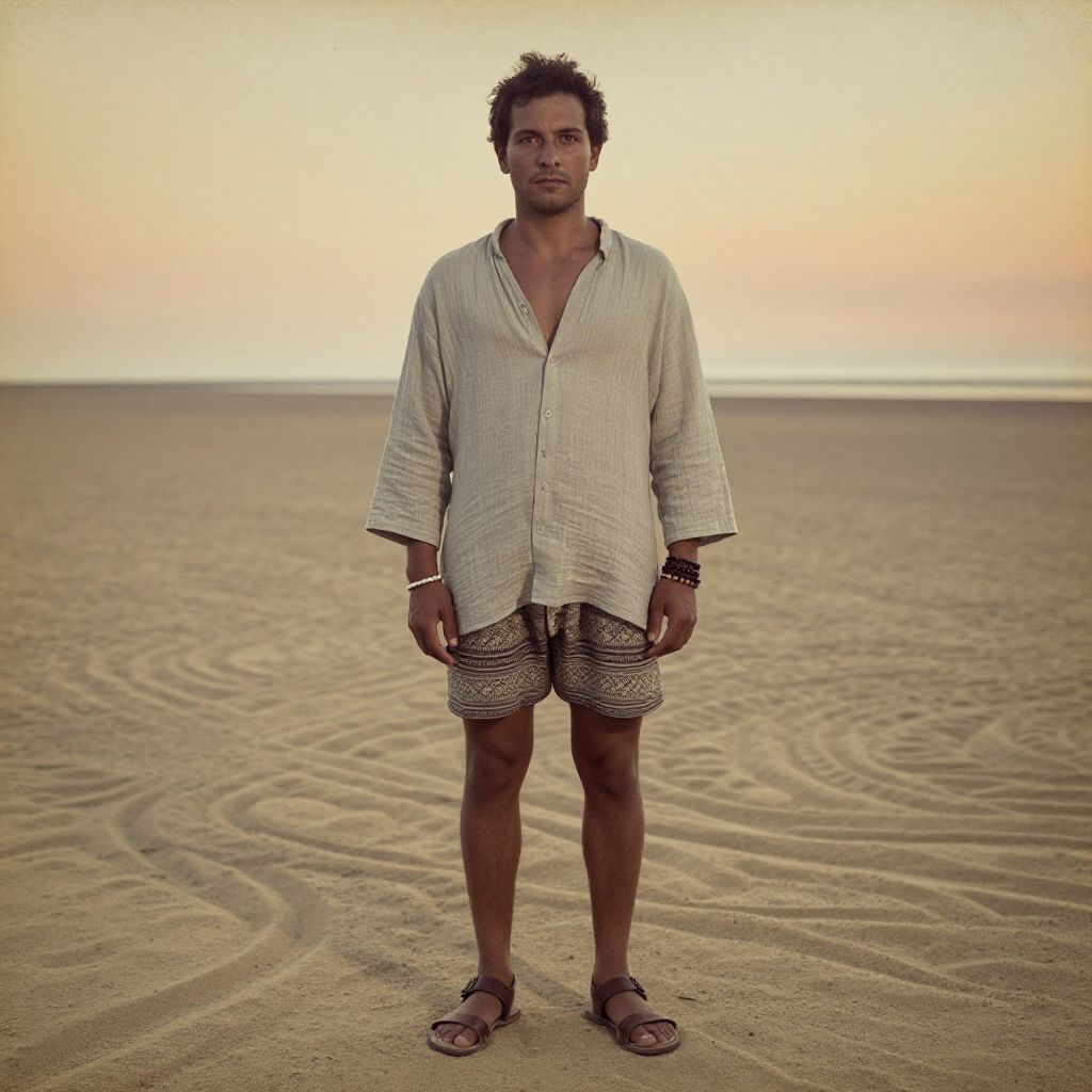 Photograph of a medium-built, dark-haired man standing on an expansive, empty sandy beach at sunset. He wears a loose, white, checkered, long-sleeve shirt with the top buttons undone, and patterned, knee-length shorts. His brown sandals reveal his toes. He has a serious expression, with a slight scruff on his face, and is accessorized with a bracelet on his right wrist. The background features a gradient sky transitioning from orange to pale yellow near the horizon. The sand has visible swirling patterns, adding texture to the scene. The overall mood is calm and reflective.