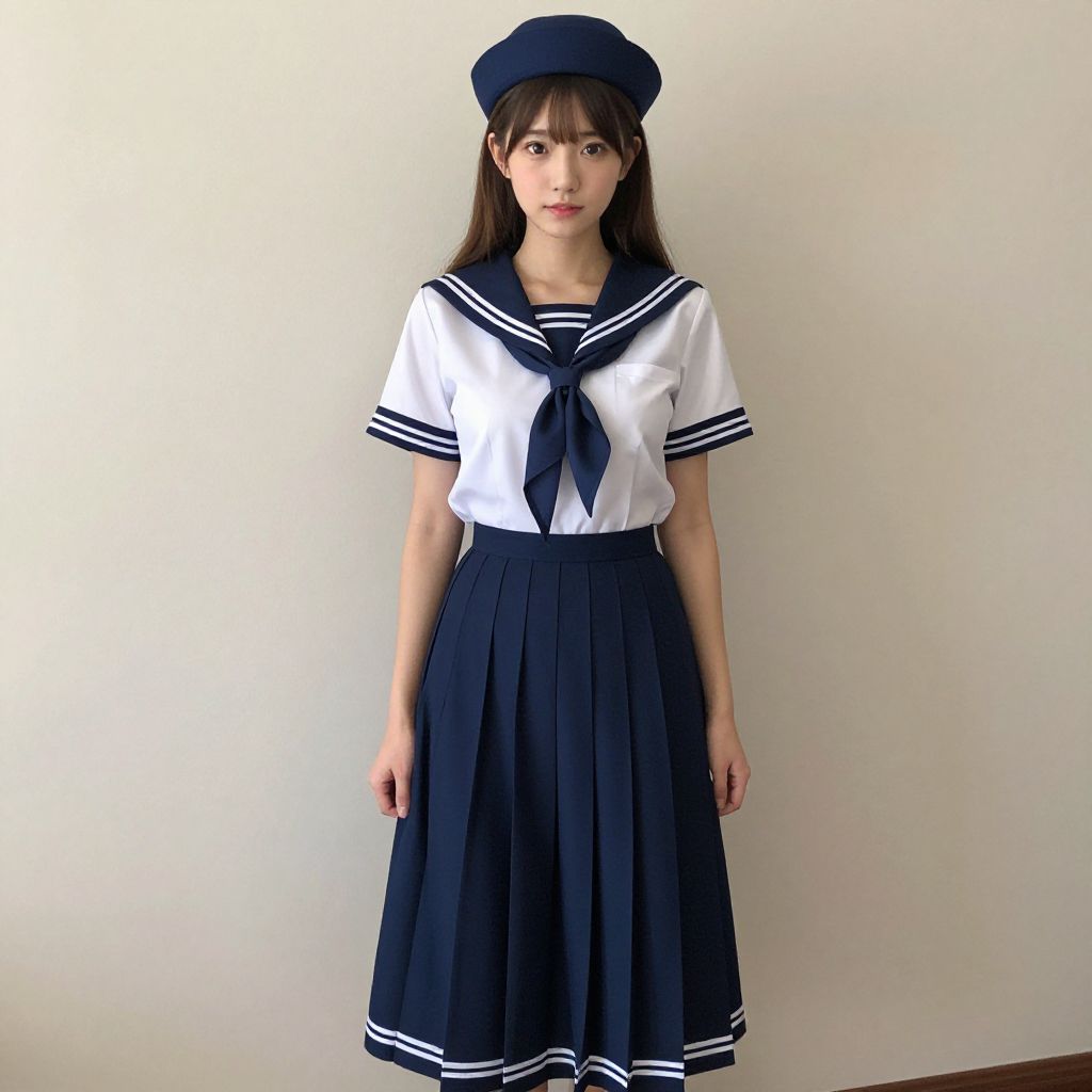 Photograph of an Asian woman in a traditional Japanese schoolgirl uniform: white sailor top with navy neckerchief, navy pleated skirt, navy hat