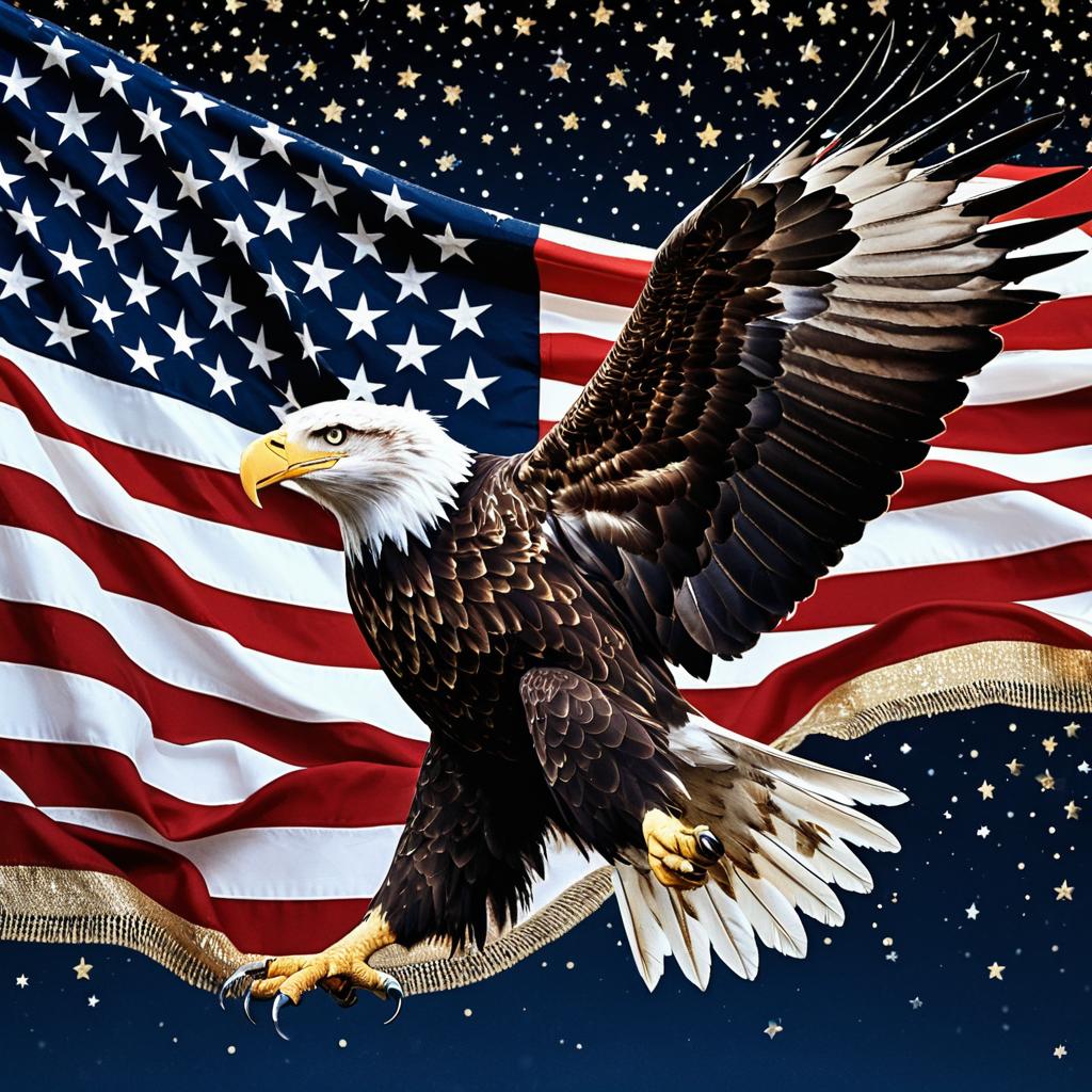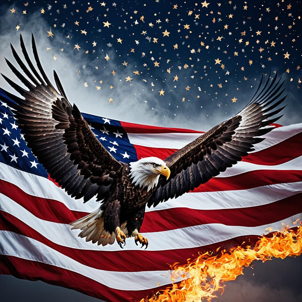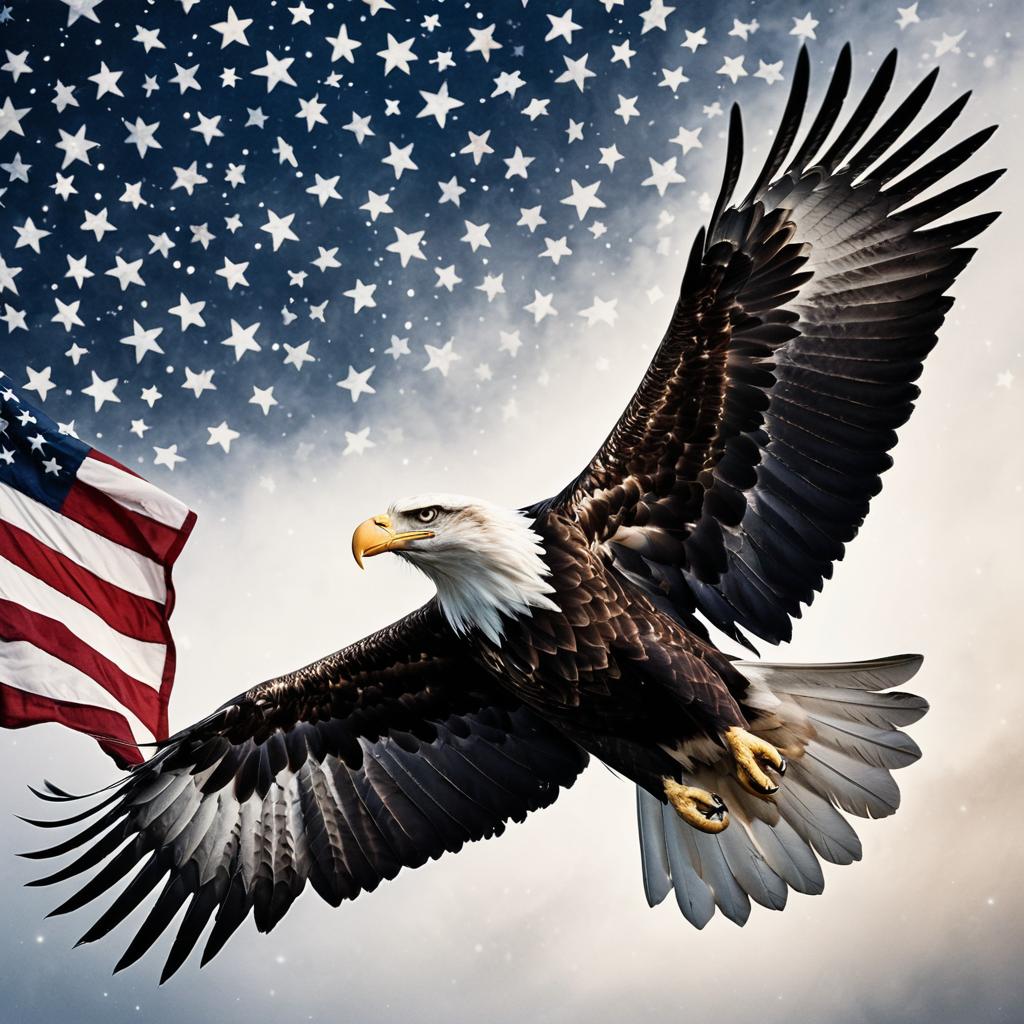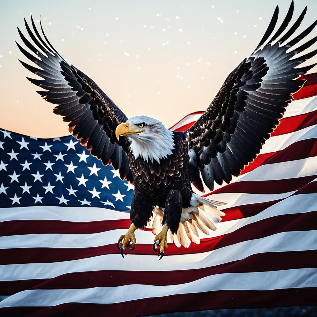 Majestic bald eagle emerging from the fabric of the American flag, its wings spread wide, as if soaring through the sky. intricate lacework of stars mingling with flame patterns on feathers, soft dawn tones blending pastel reds, blues, and gleaming whites