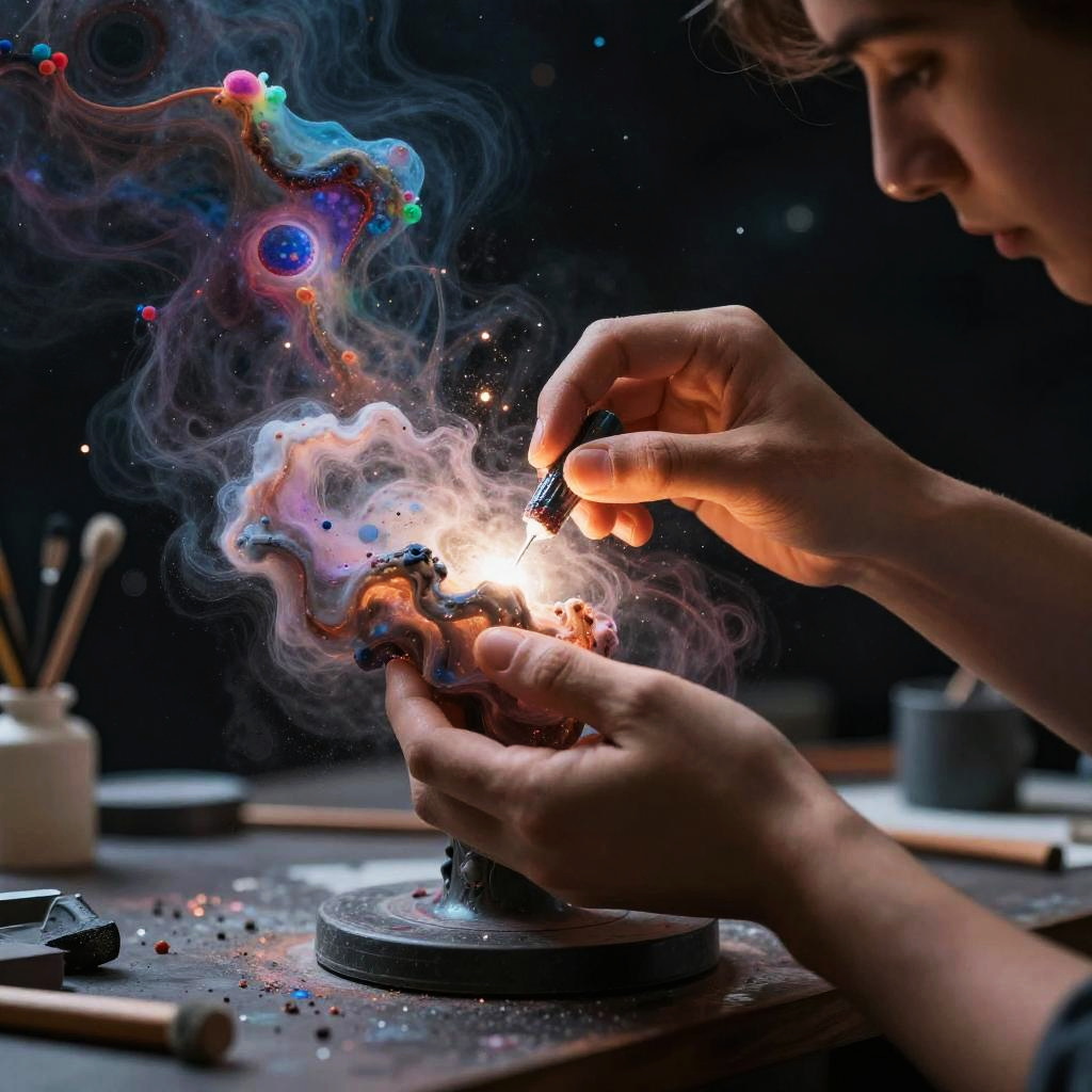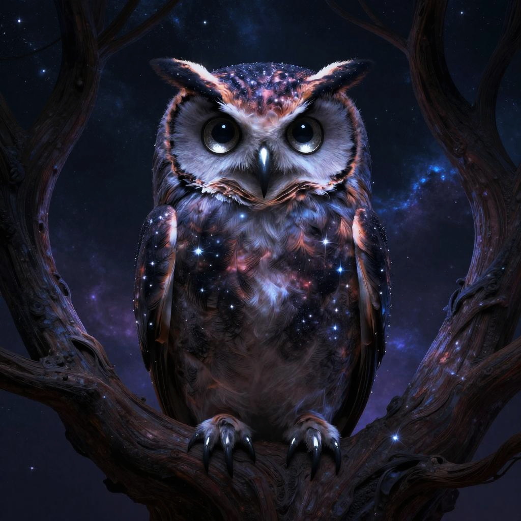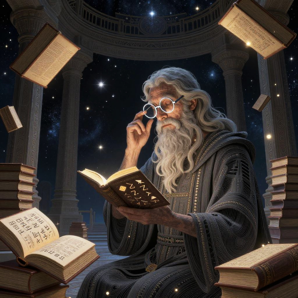 An abstract digital artwork of an ancient celestial librarian, featuring floating books wrapped with glowing runes and silver spectacles, in an infinite hall of cosmic knowledge with starry pillars, created in fantasy realism with intricate linework and luminous accents, with wise and contemplative