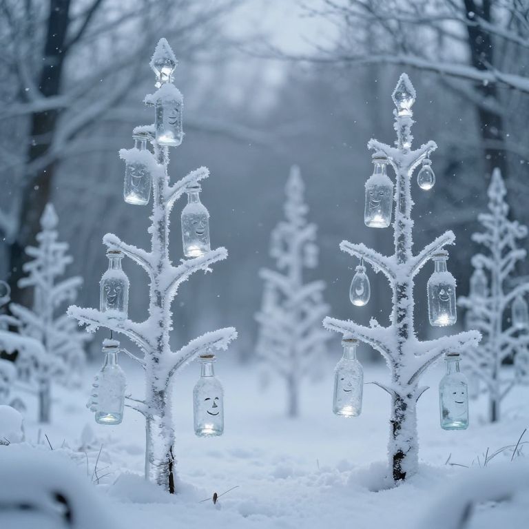 Amidst the hushed stillness of winter, glass trees adorned with frozen laughter bottles stand as ethereal sentinels, their crystalline forms resonating with the gentle hum of serenity and the promise of renewal, while their chiming melodies weave a spell of wonder and introspection.