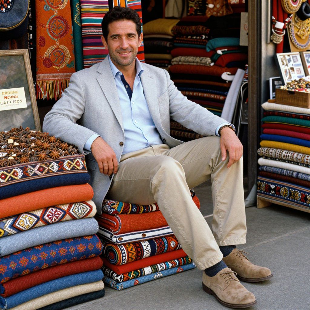 Photograph of a handsome, middle-aged man with short dark hair and light stubble, sitting on a stack of vibrant, patterned textiles. He wears a light gray blazer over a white shirt, beige pants, and tan suede shoes. His right arm rests on the textiles, while his left hand is on his knee. The background features colorful, intricately designed blankets and pillows displayed in a shop. The textures of the fabrics are rich and varied, including geometric and tribal patterns in red, blue, orange, and brown. A small sign reading "New Arrival" is visible on the left. The man smiles confidently at the camera.