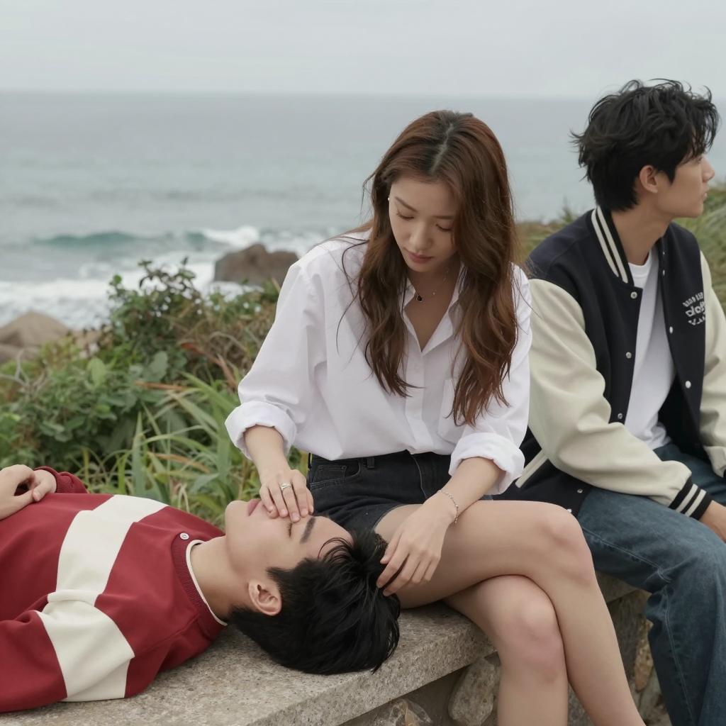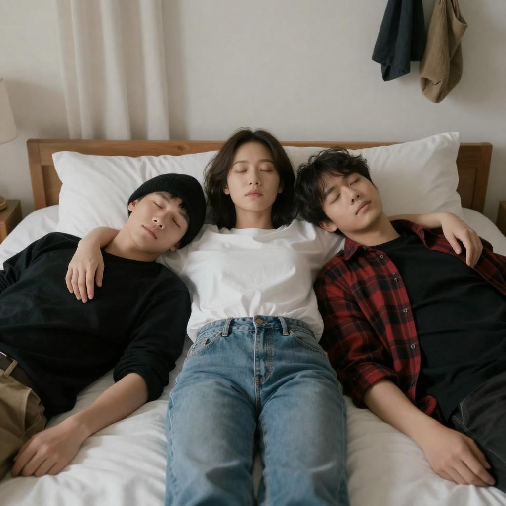 Three people on a bed, lying closely. Middle person, woman, white shirt, blue jeans, arm around right person, man, red plaid shirt, black shirt underneath. Left person, man, black beanie, black shirt. All relaxed, eyes closed. Background with curtains, lamp, and hanging items.