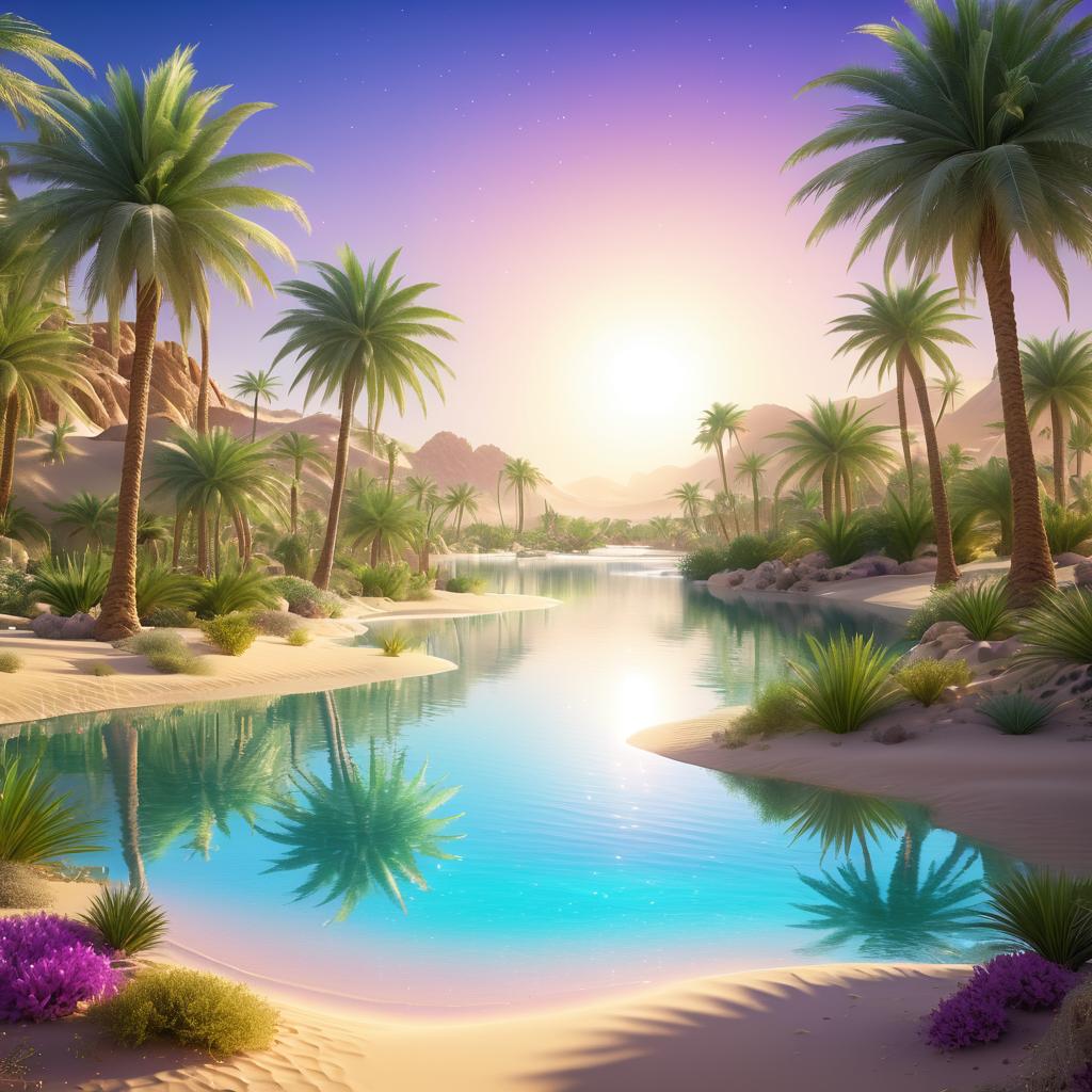 Fantasy digital illustration of a vast desert oasis featuring clear blue sparkling water surrounded by numerous green palm trees, sandy shores, rocky formations, and distant mountains under a colorful gradient sky. The scene evokes a magical atmosphere with high detail and vibrant lighting.
