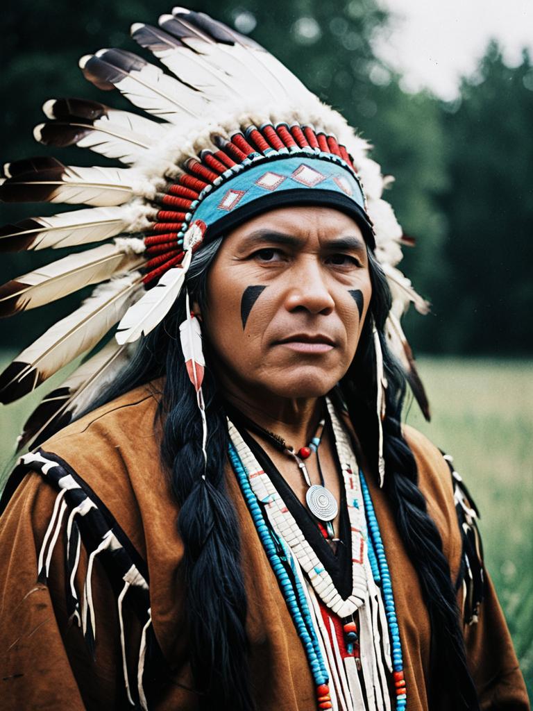 Man in American Indian costume, photorealistic cosplay portrait, cinematic realism